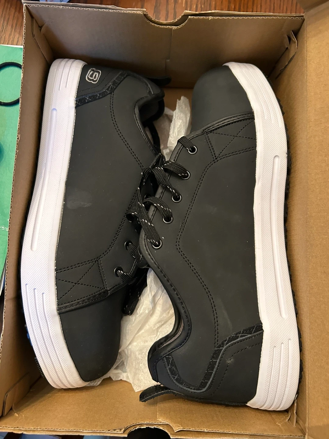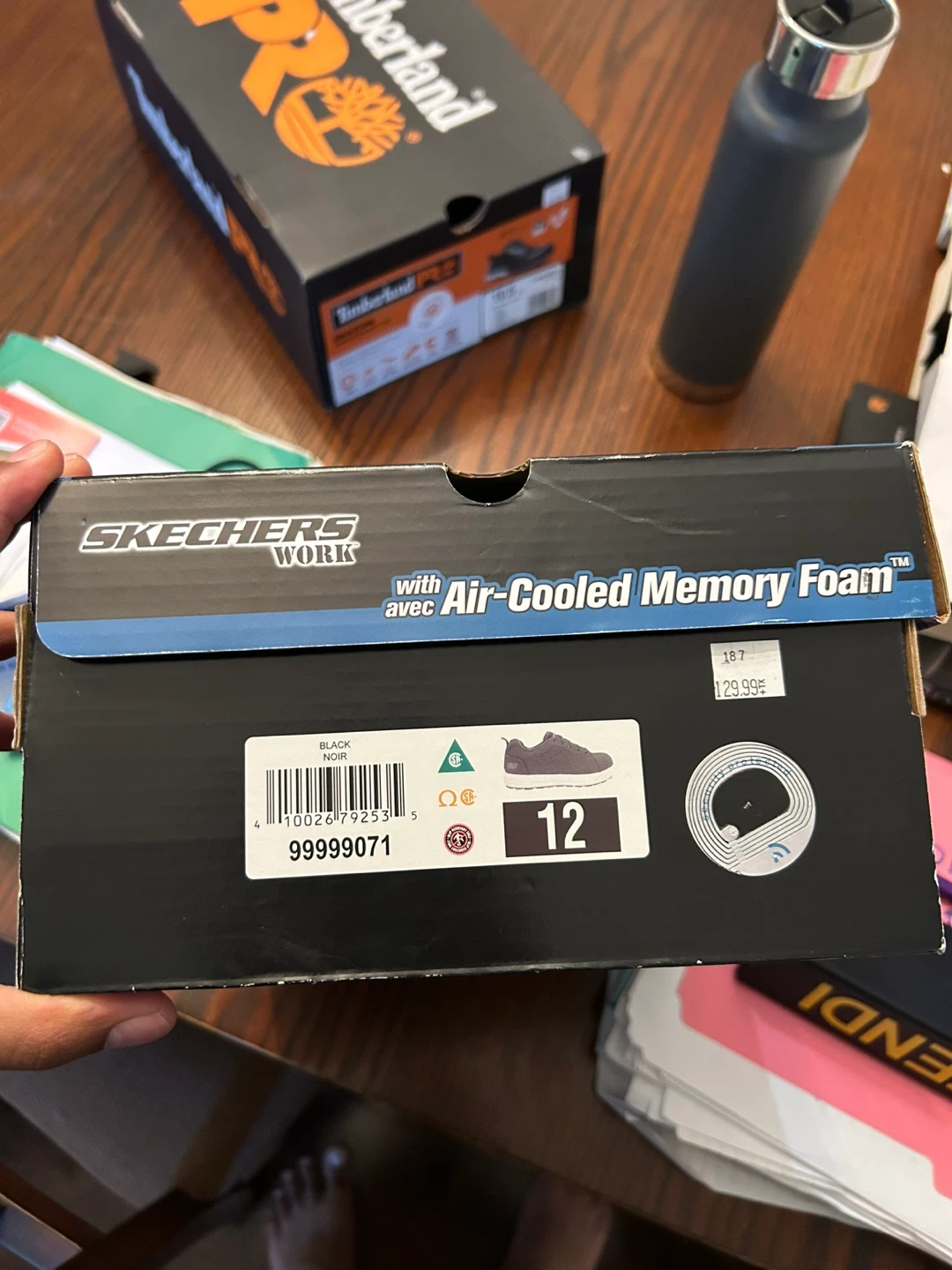 Selling a pair of steel toe Skechers Work shoes in black, size 12. These come with the original box and feature Air-Cooled Memory Foam for extra comfort. They're in great condition and ready for a new home!