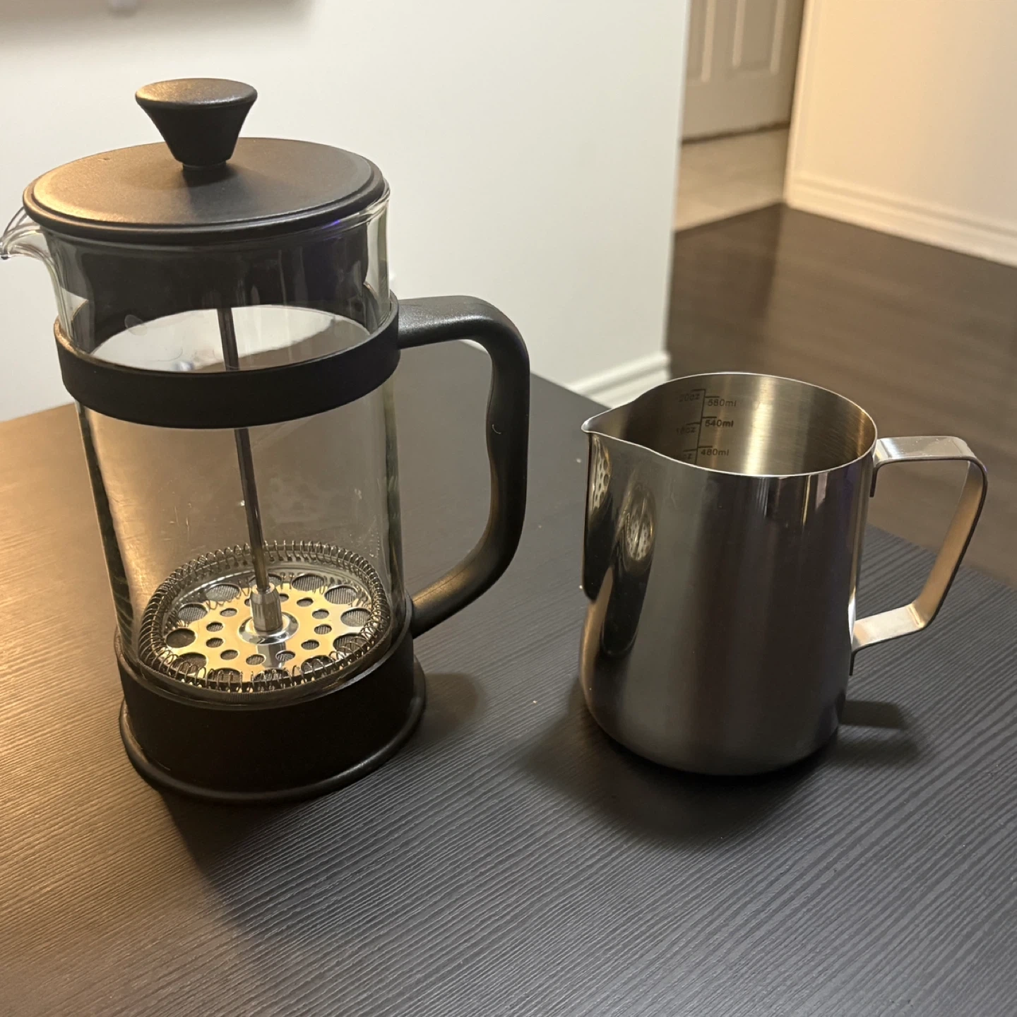 Selling a French press and a milk pitcher together. Used only single time for practice of latte arts Condition like new Pick up at a condo near North York Centre Station
