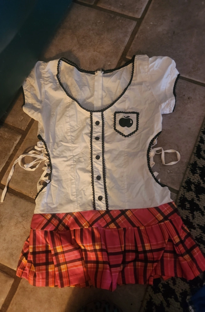 Cute white top with black trim and a plaid skirt. The top has a small apple detail. Perfect for a fun costume or cosplay!