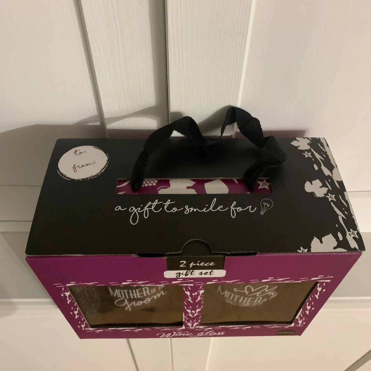 This is a 2-piece gift set featuring one glass that says "Mother of the Groom" and another that says "Mother of the Bride"