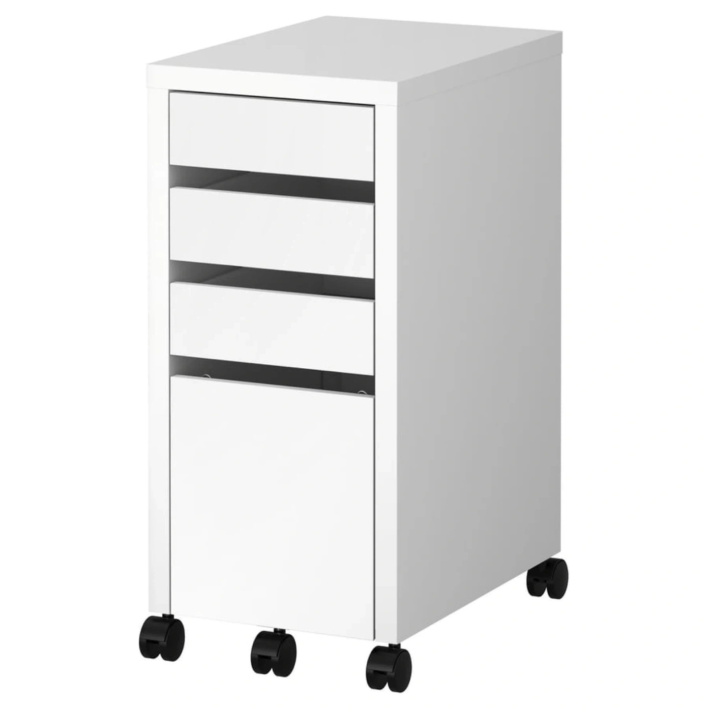 Looking to organize your workspace? I'm selling an MICKE drawer unit on wheels in white. It features four drawers and a clean, minimalist design. The dimensions are 35 cm (13 3/4") wide, 50 cm (19 5/8") deep, and 75 cm (29 1/2") high. Perfect for storing all your office essentials!