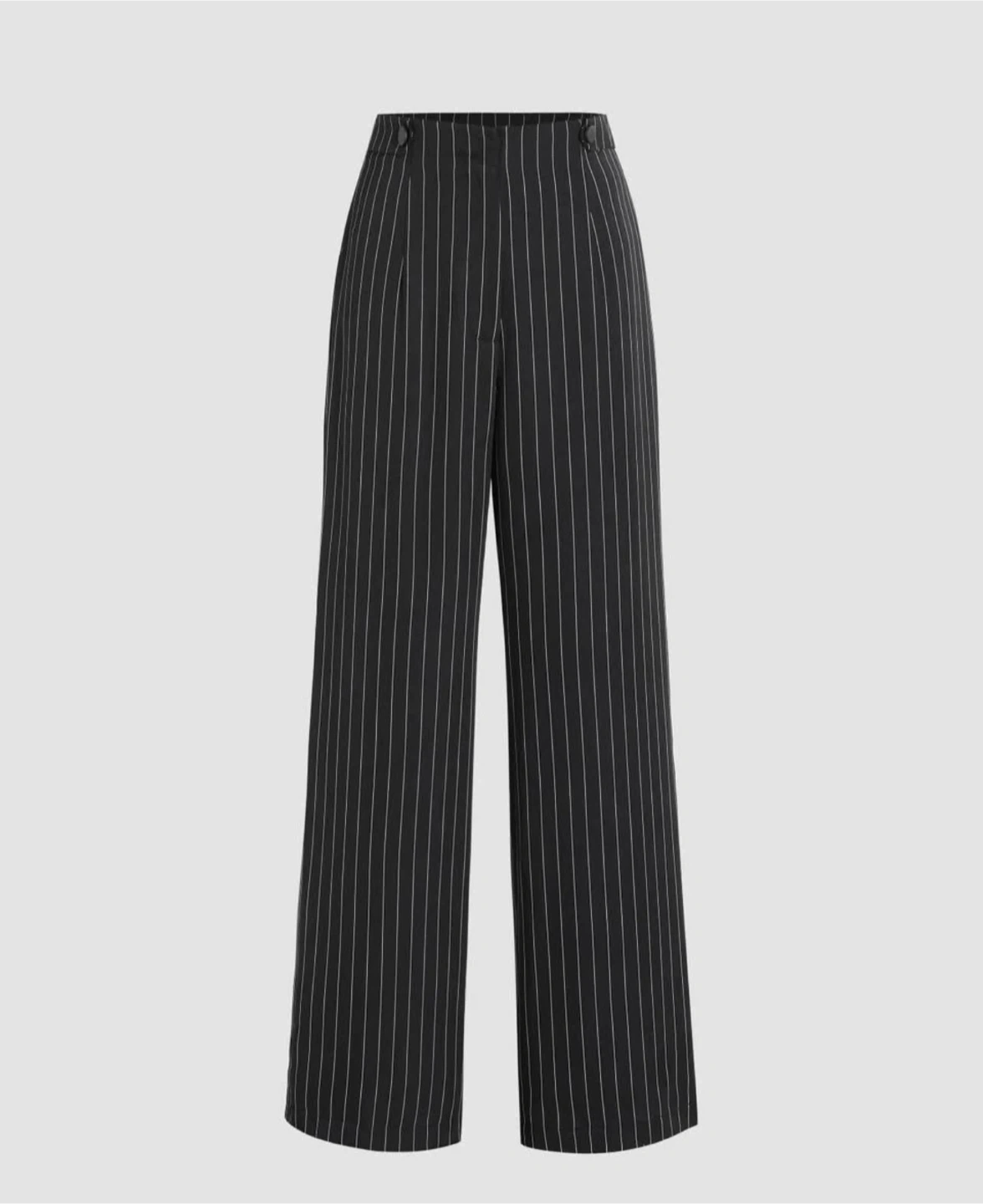 10Selling a pair of cider black striped wide leg pants in size small. These pants are in great condition and feature a stylish striped pattern and a comfortable wide leg fit. Perfect for a casual or dressy look!