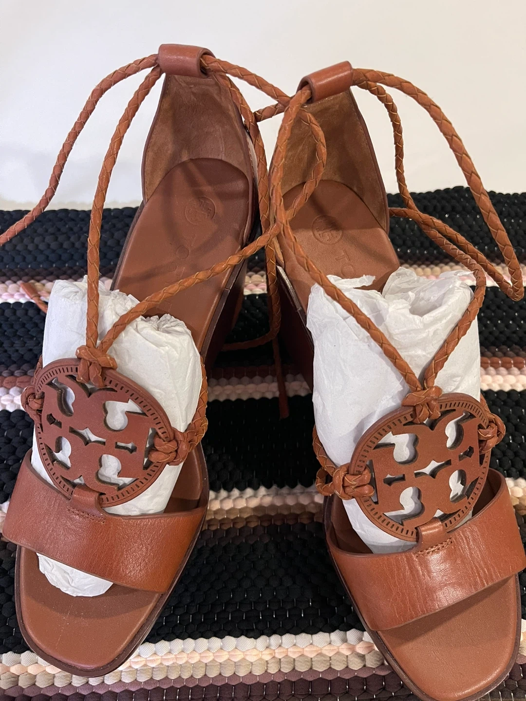10These are a pair of gently used Tory Burch wedge sandals. They feature a brown leather upper and the signature Tory Burch logo on the front. The wedges are comfortable and stylish, perfect for adding a touch of elegance to any outfit!