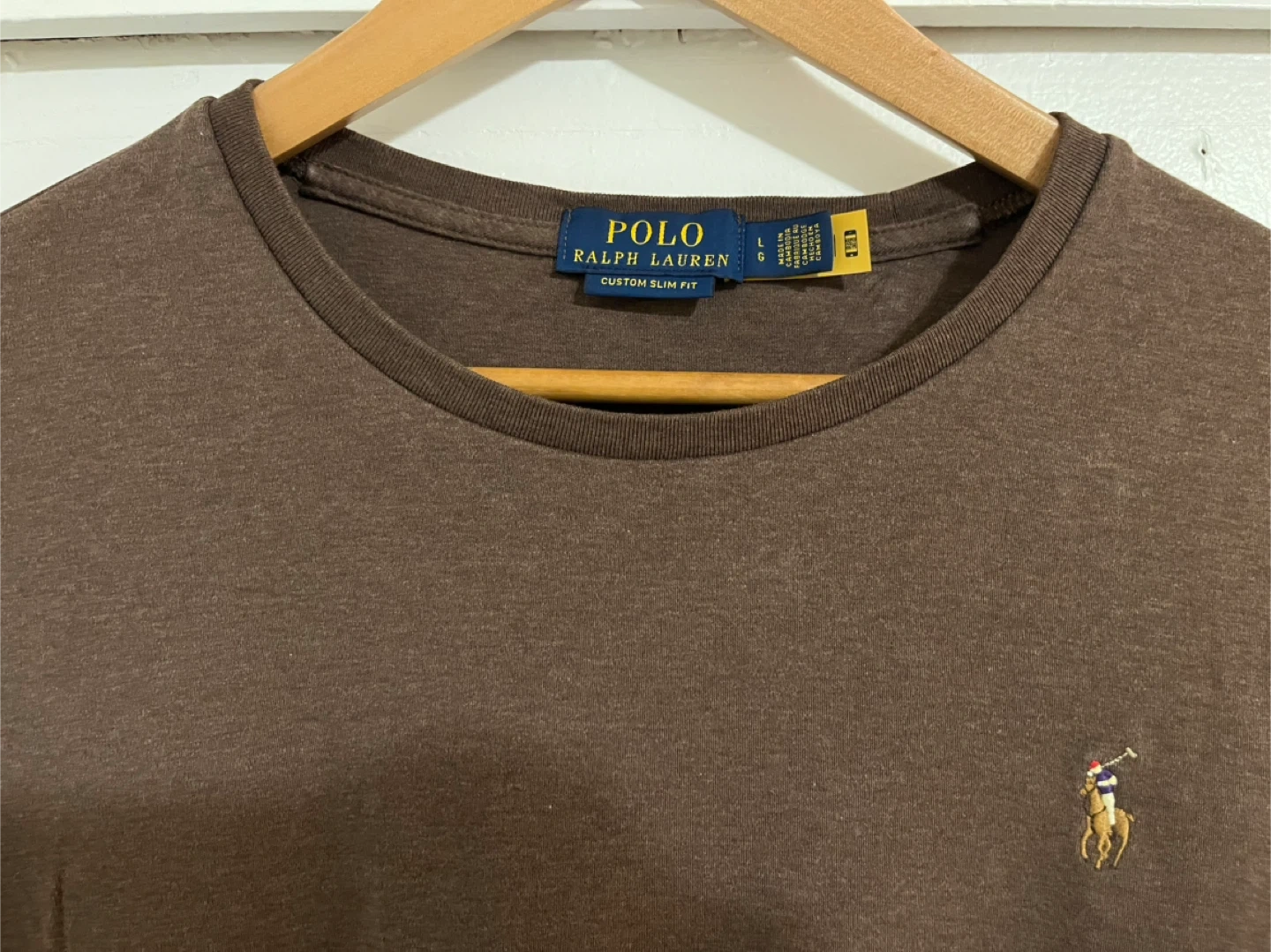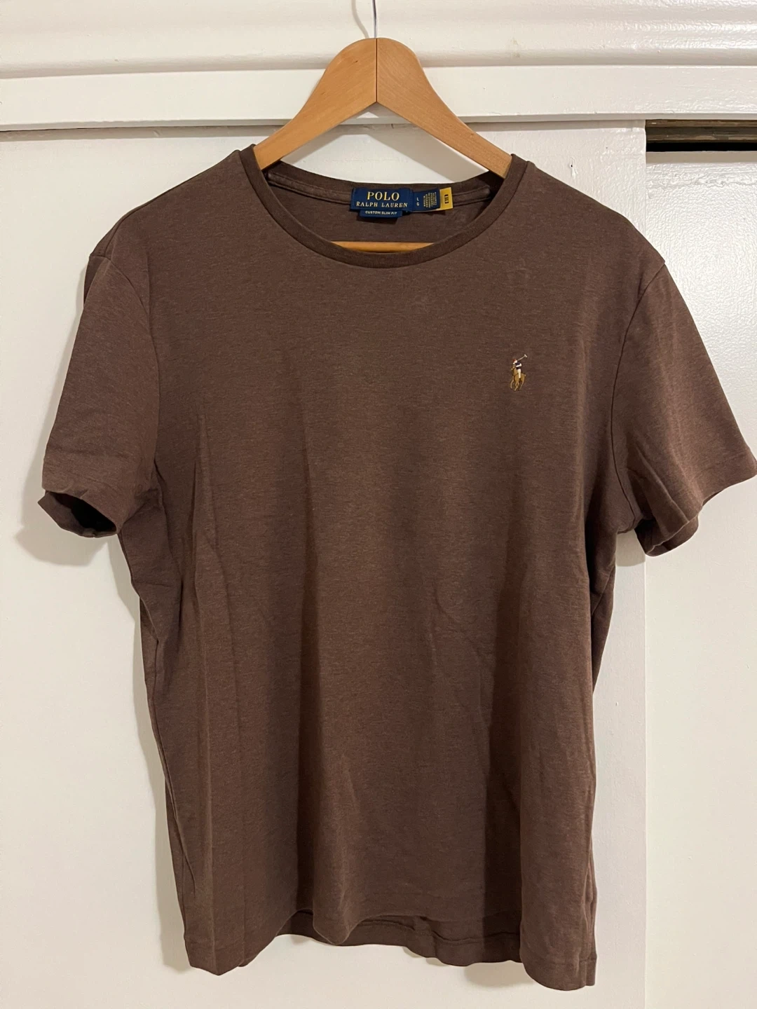 Selling a Polo Ralph Lauren t-shirt in size large. It's a custom slim fit and in a nice brown colour. Great for casual wear!