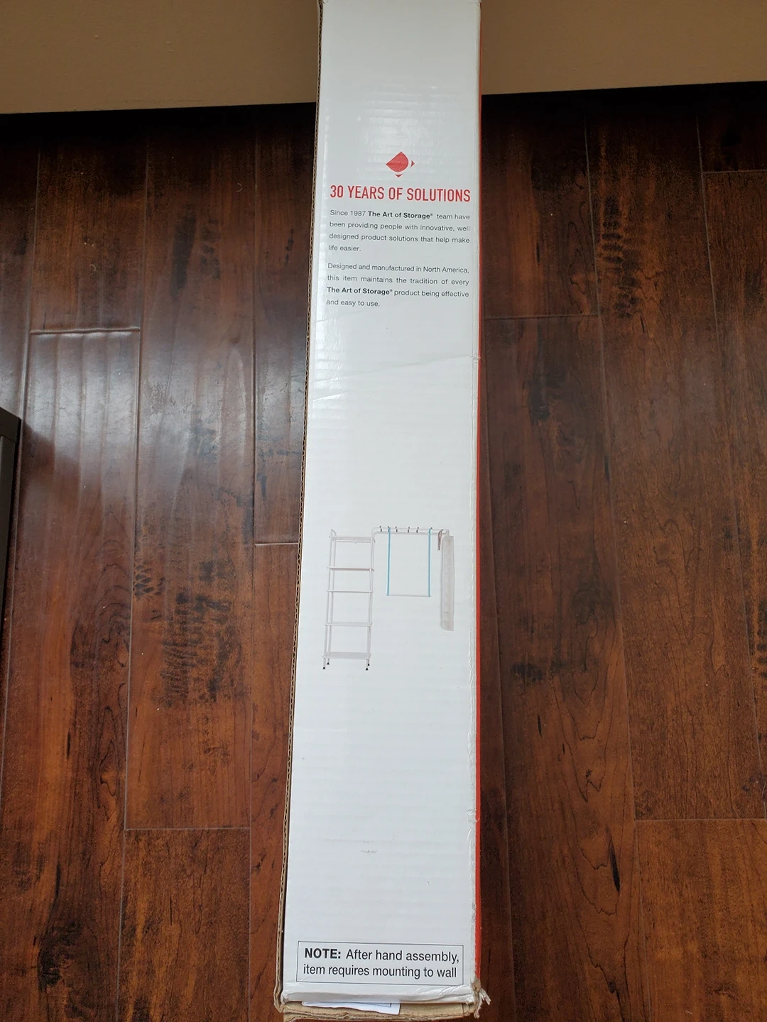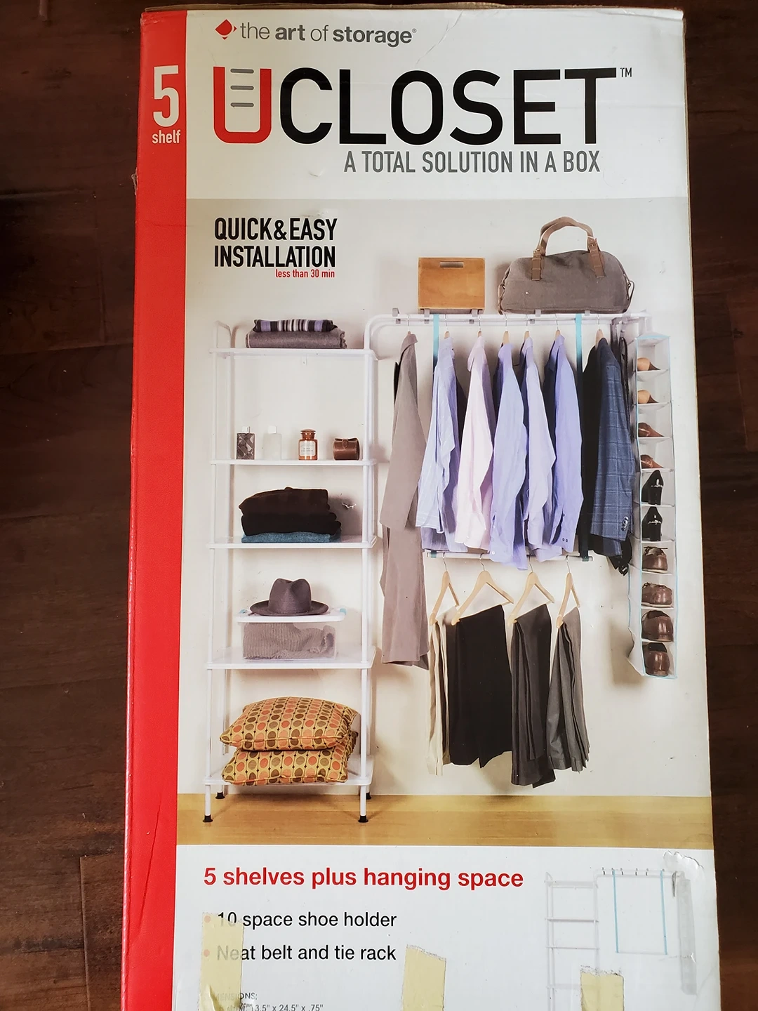 Brand new, open box. After opening the box, I realized it's bigger for my closet. Please check your closet dimensions to ensure it fits in. It has metal shelves , very sturdy. It needs to be fixed with the closet wall in 2 or 3 points.
