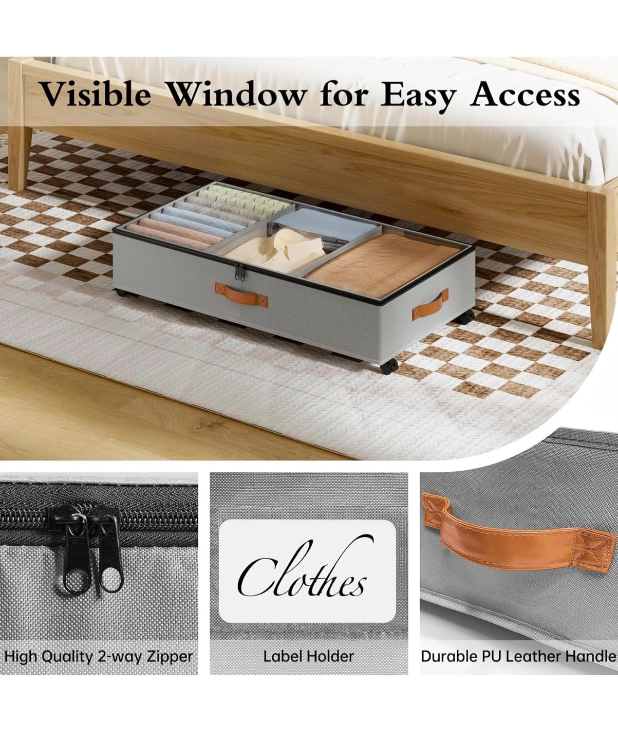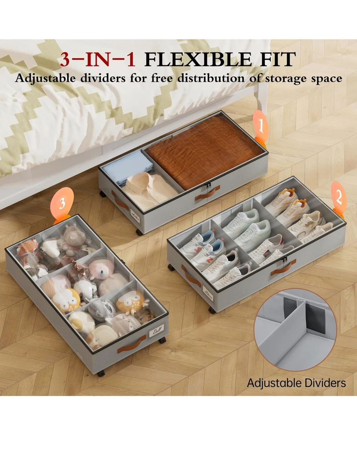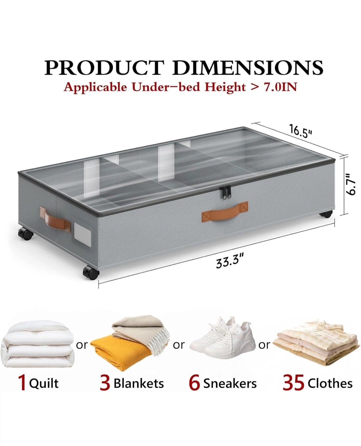61Declutter your space with this handy underbed storage box! It features adjustable dividers for customized storage, perfect for clothes, shoes, toys, and more. The 360° rotating wheels make it easy to pull out from any direction, even on carpet. - Dimensions: 33.3" x 16.5" x 6.7" - Applicable under-bed height: >7.0IN - Detachable design for versatile use