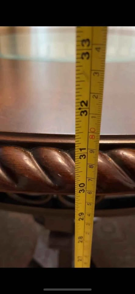 Table diameter is 43 inches, Height is 31 inch. Solidly built.