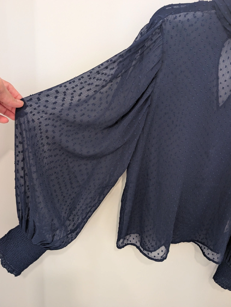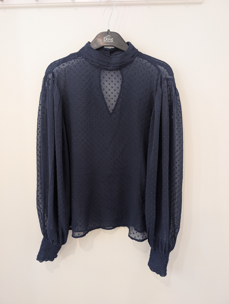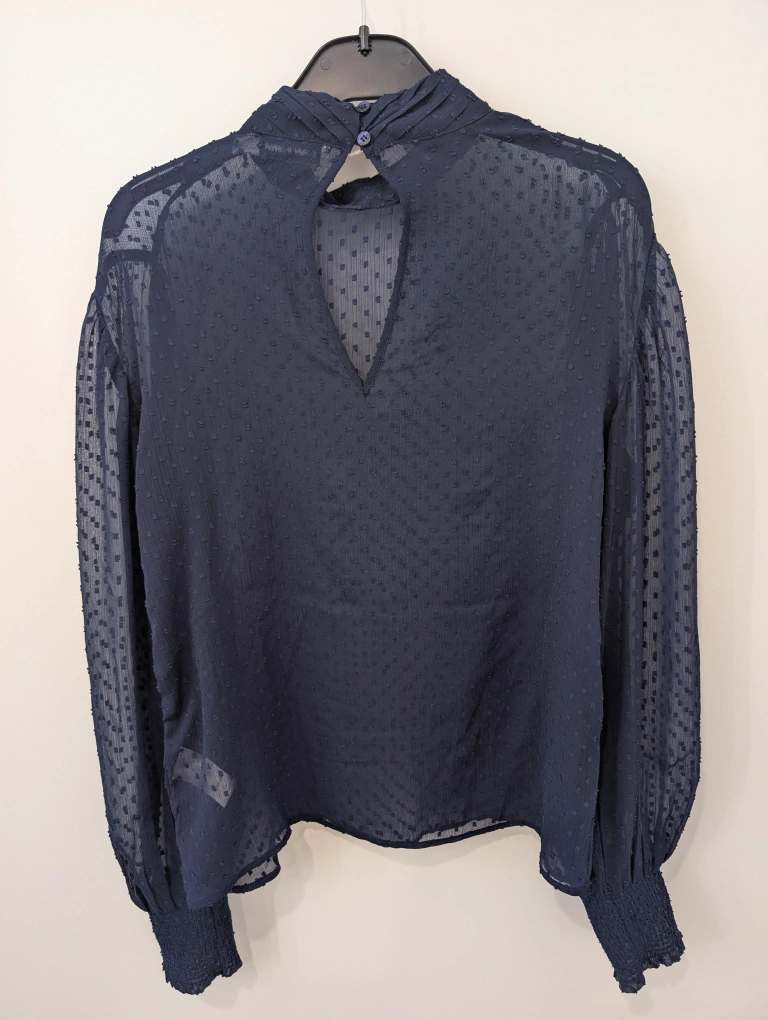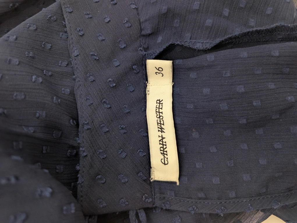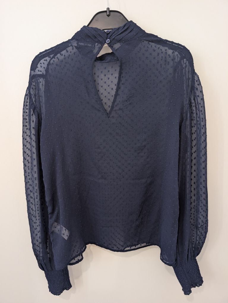 Here's a lovely navy blouse from Carin Wester! It's a size 36 and features a unique textured pattern throughout. Balloon sleeves give a touch of elegance to the design. Perfect for dressing up or down!