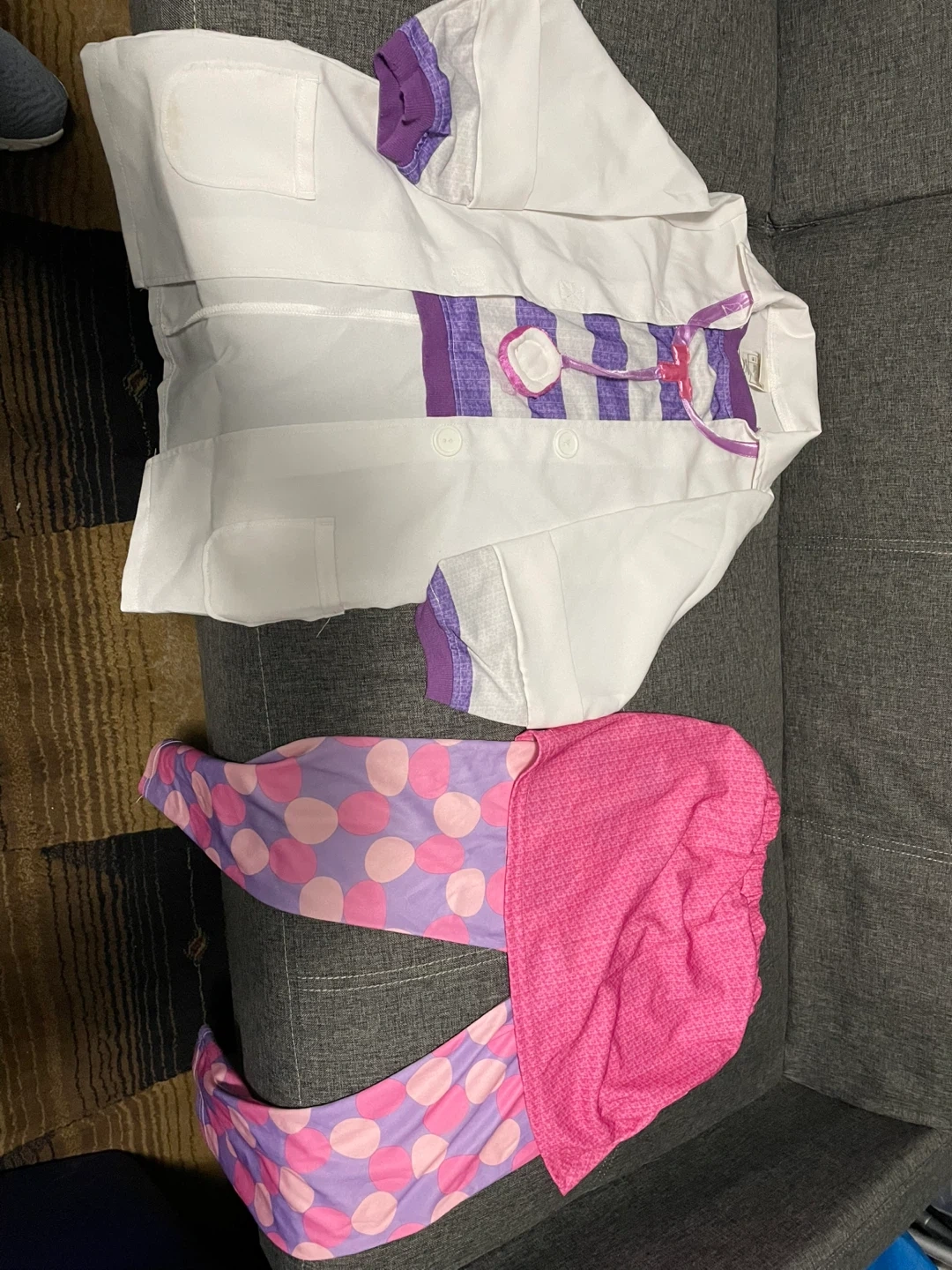 Your little one will love dressing up as Doc McStuffins with this adorable costume set! It includes the signature white lab coat with purple accents, a striped shirt, polka dot leggings, and a pink skirt. Perfect for imaginative play and themed parties!