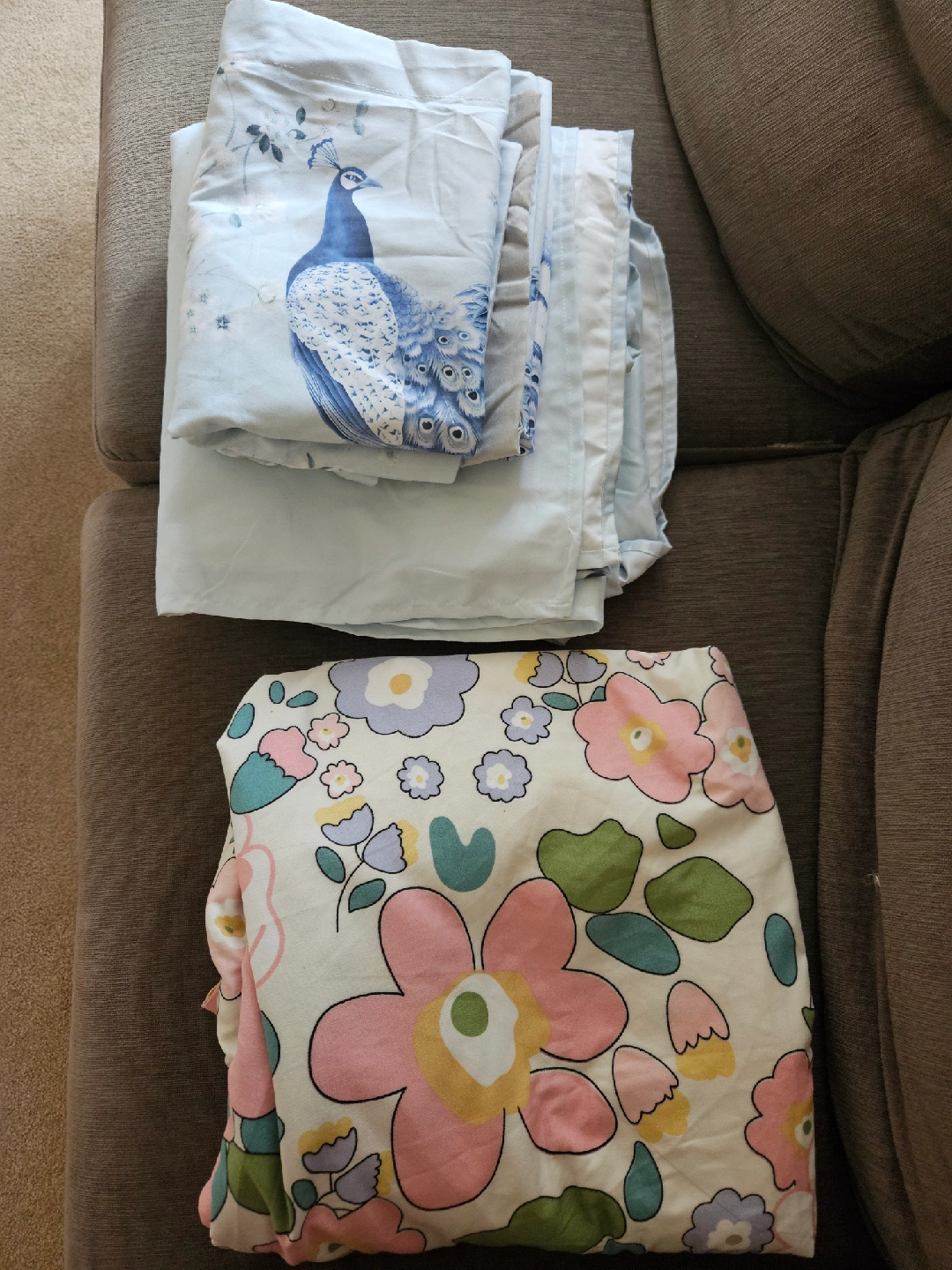 Selling two bedsheets! One features a beautiful peacock design in light blue, and the other has a cheerful floral pattern with pink and green flowers. Both are in great condition and ready to brighten up your bedroom