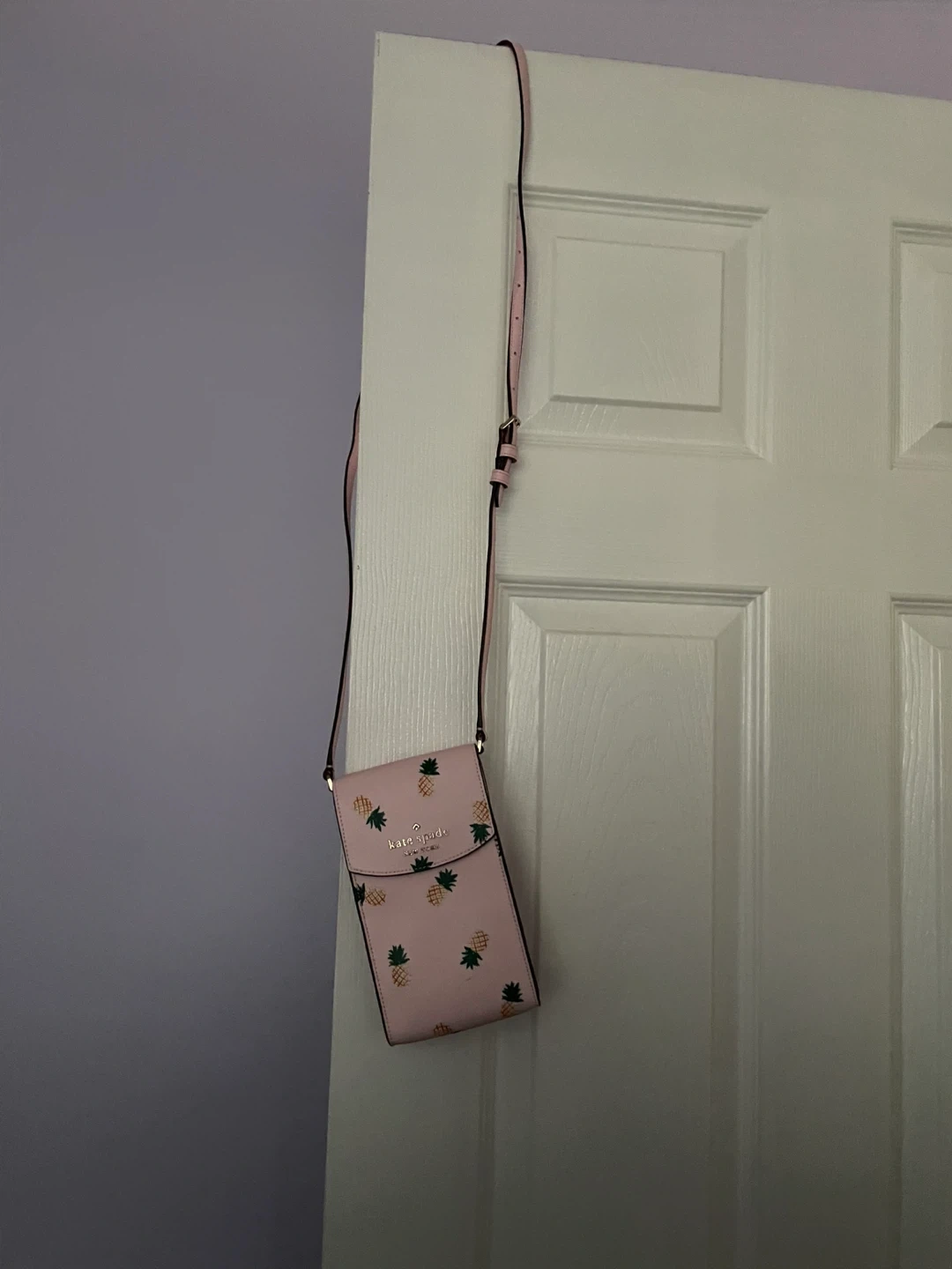Selling a cute Kate Spade phone crossbody bag! It's a light pink colour and has a fun pineapple pattern. Perfect for carrying your phone and a few essentials when you're on the go!