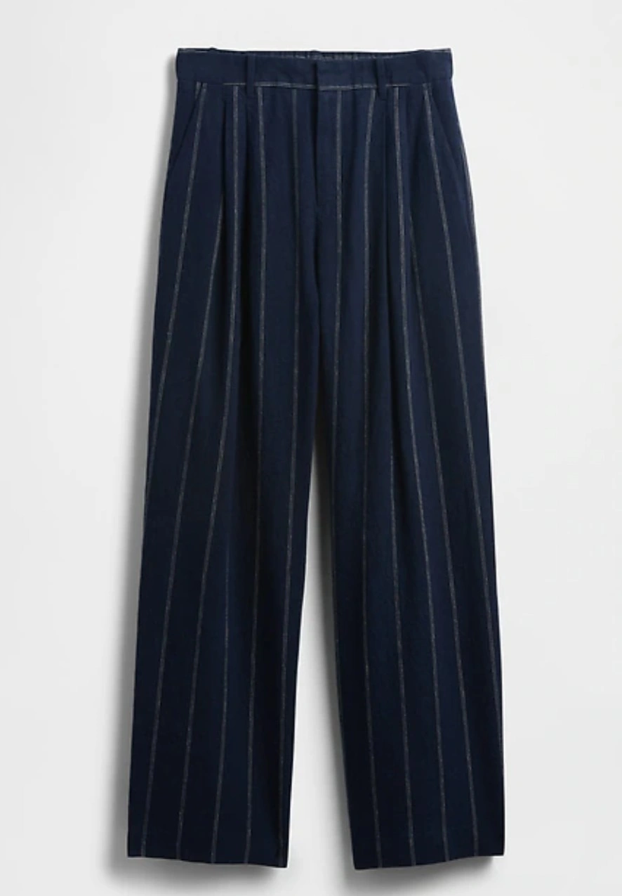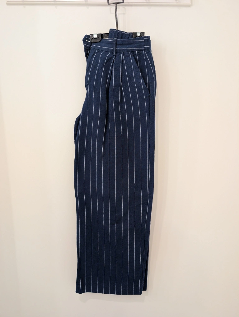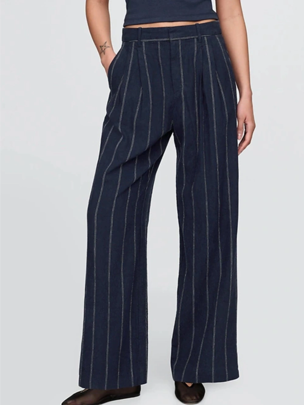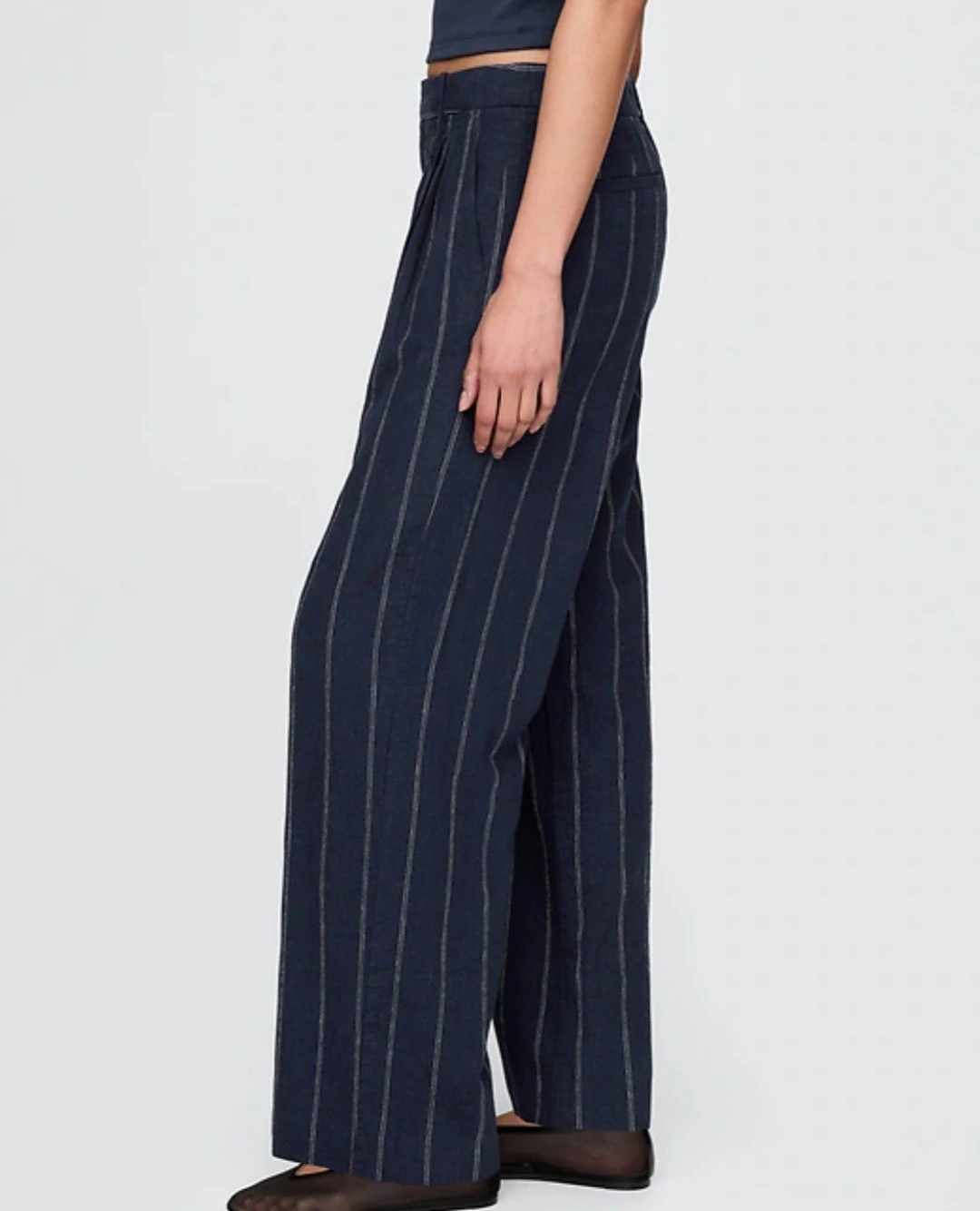 Selling a pair of GAP striped wide-leg trousers in linen blend. They're comfortable and stylish navy blue with subtle pinstripes. These trousers are perfect for a sophisticated and comfortable look. Like new!