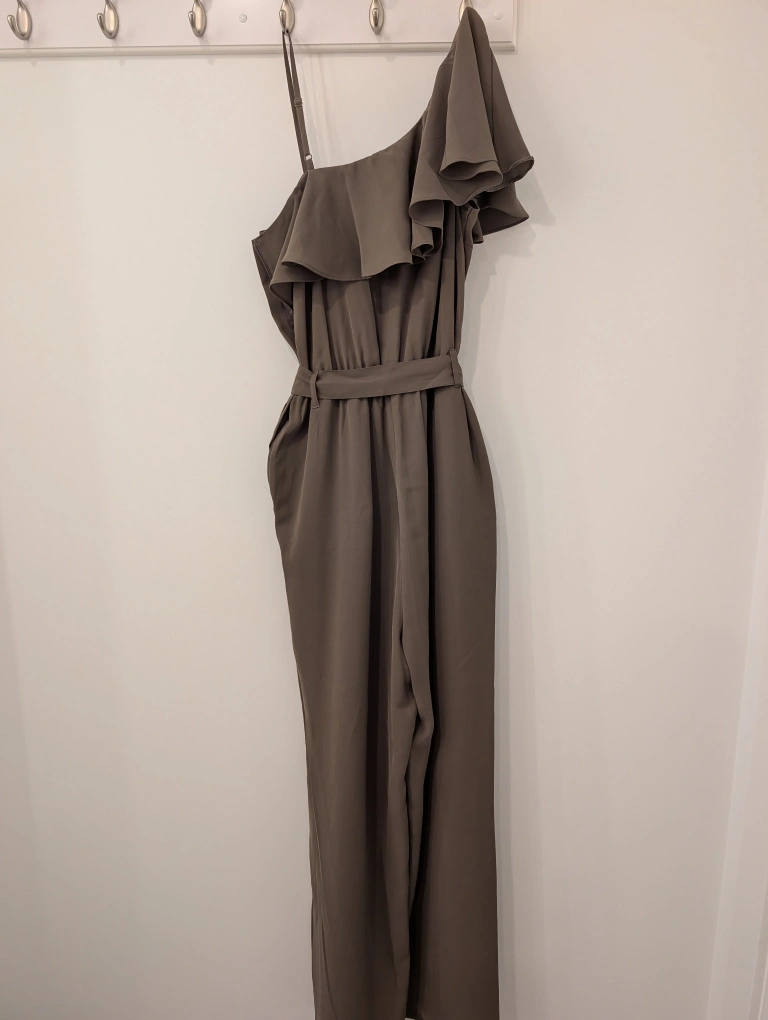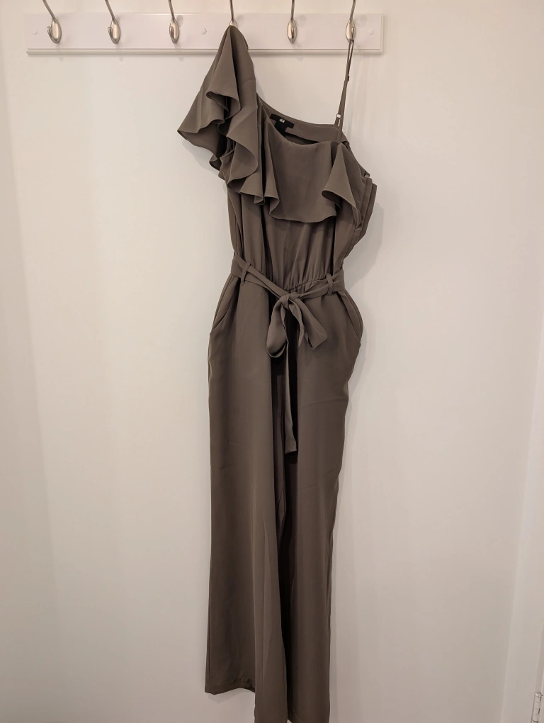 Selling a cute H&M wide leg jumpsuit in olive green! It features a stylish one-shoulder design with ruffles and a tie waist. It's a size 38 and in great condition.