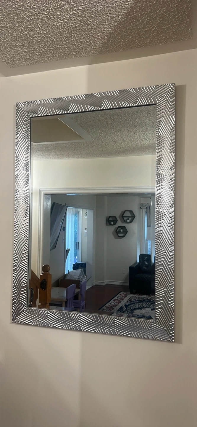 Selling a lovely mirror with a silver patterned frame. It's in great condition and would look great in any room of the house 41 inches height x 29 inches width