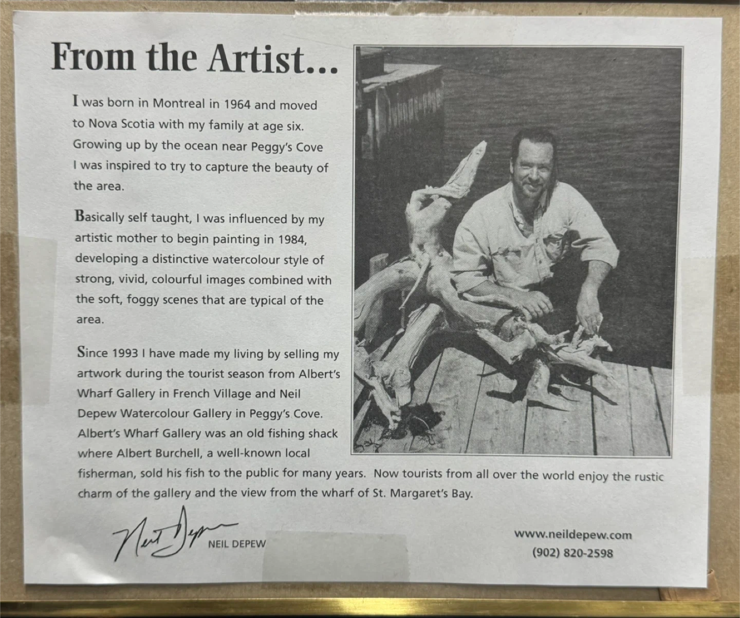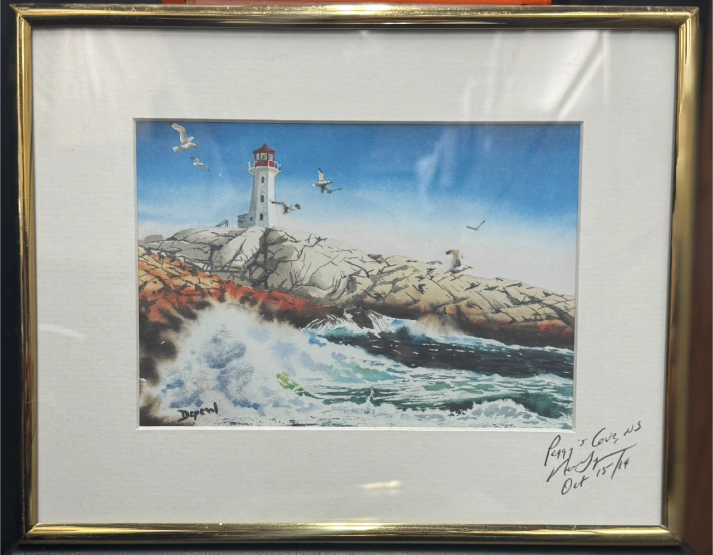 65Selling a beautiful watercolour painting by Neil Depew of Peggy's Cove, NS. The painting captures the beauty of the area with vivid and colourful images. It's framed and ready to hang! It is also Signed and Dated Oct 15/14