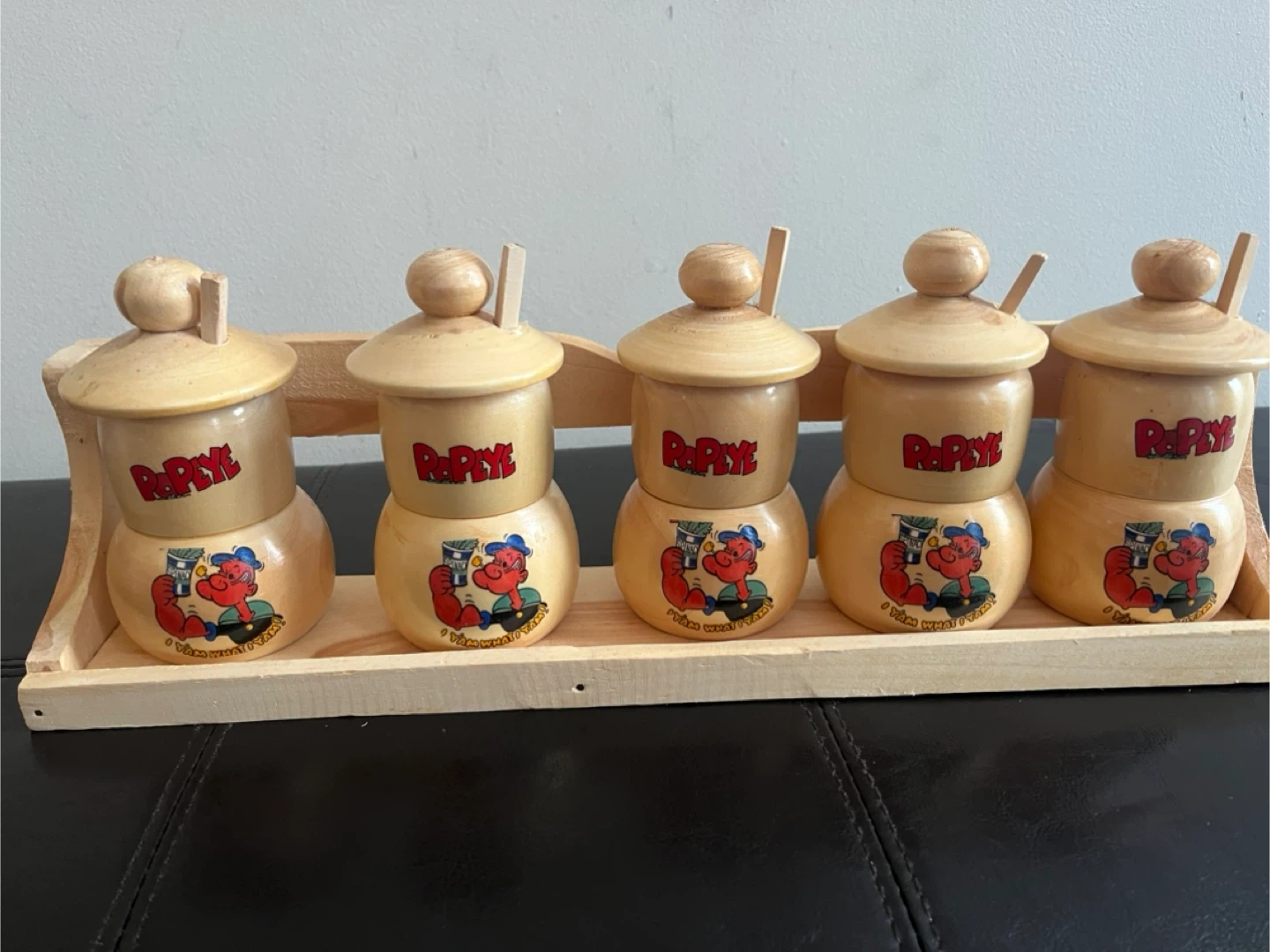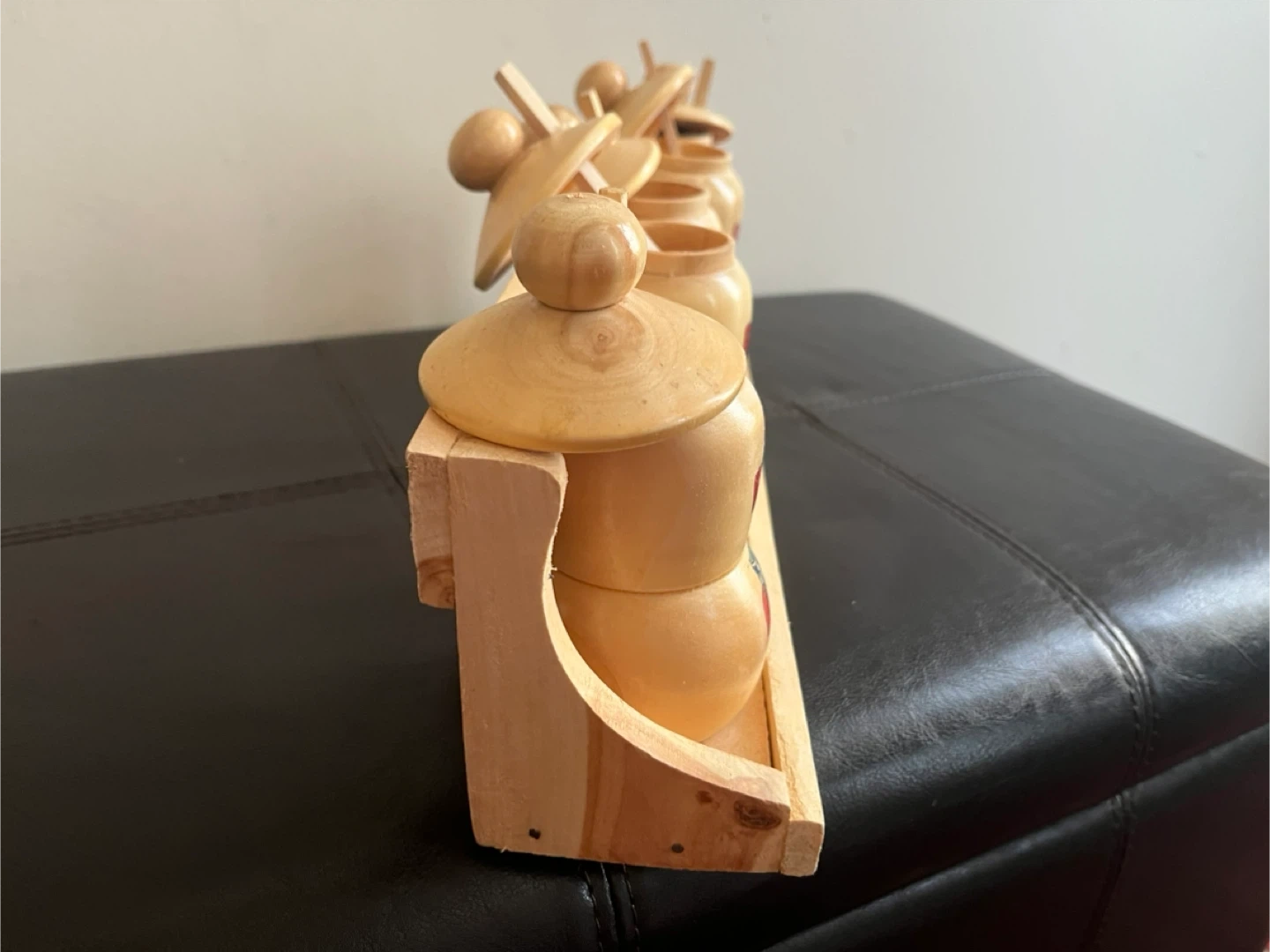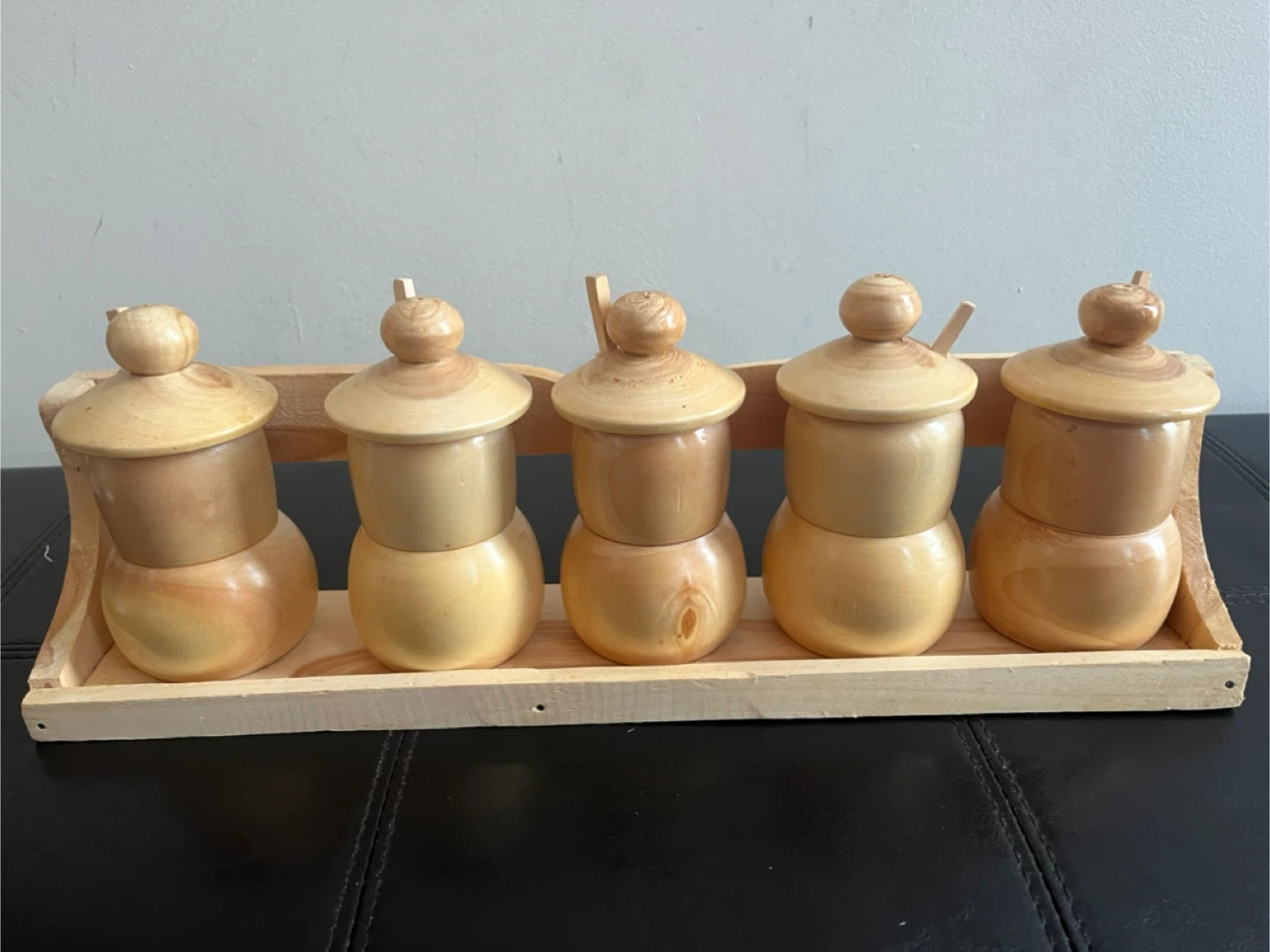 The jars sit in a wooden hand crafted holder. Perfect for adding a touch of nostalgia to your kitchen!
