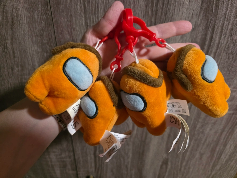 Selling Among Us plush keychains! They're in great shape and ready to clip onto your backpack or keys. Each one is a little orange crewmate with a brown hat. Perfect for fans of the game!