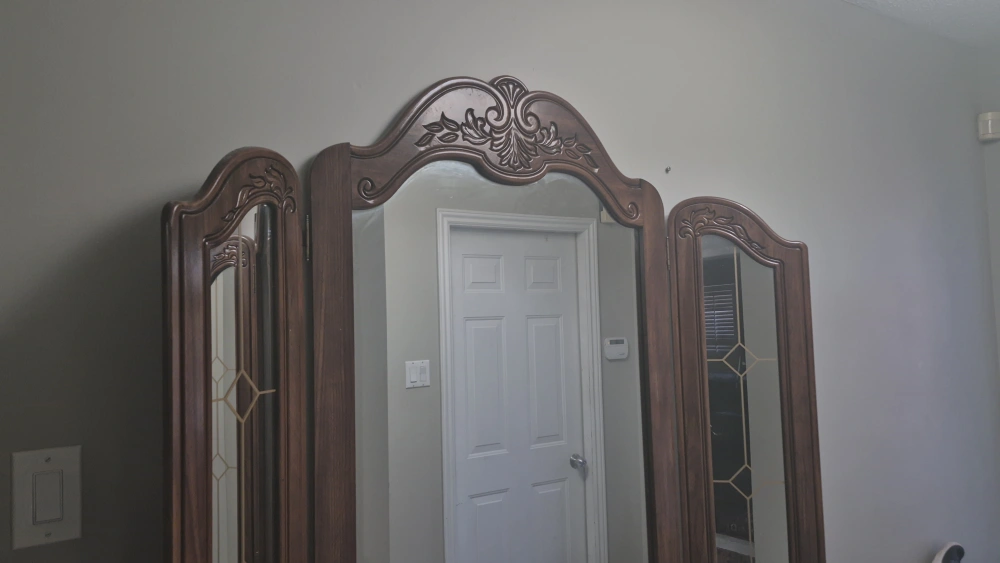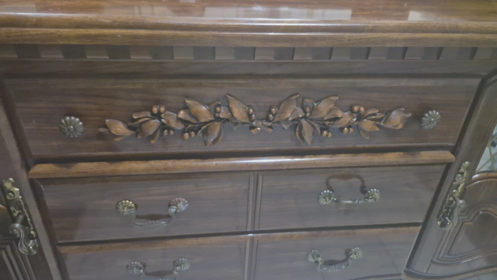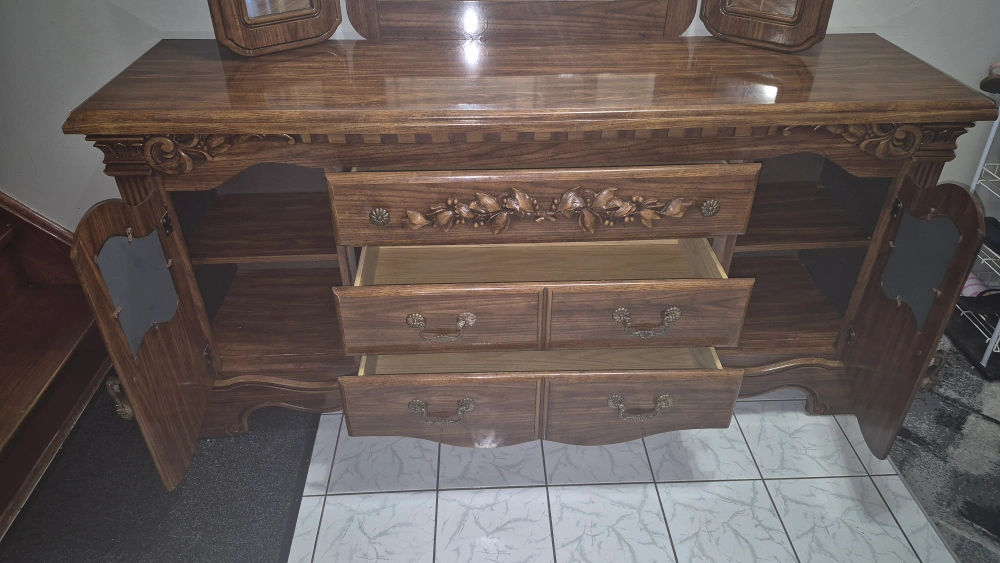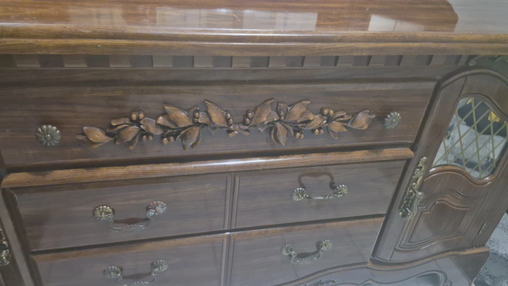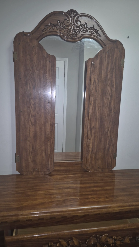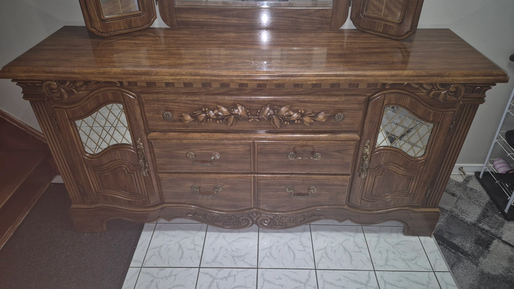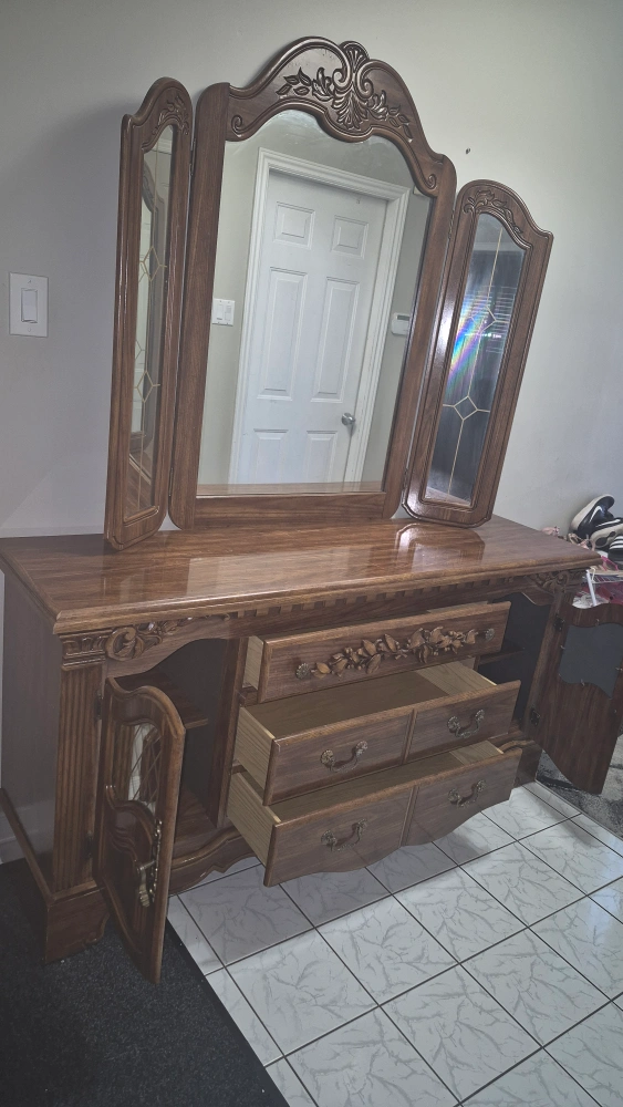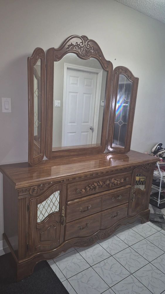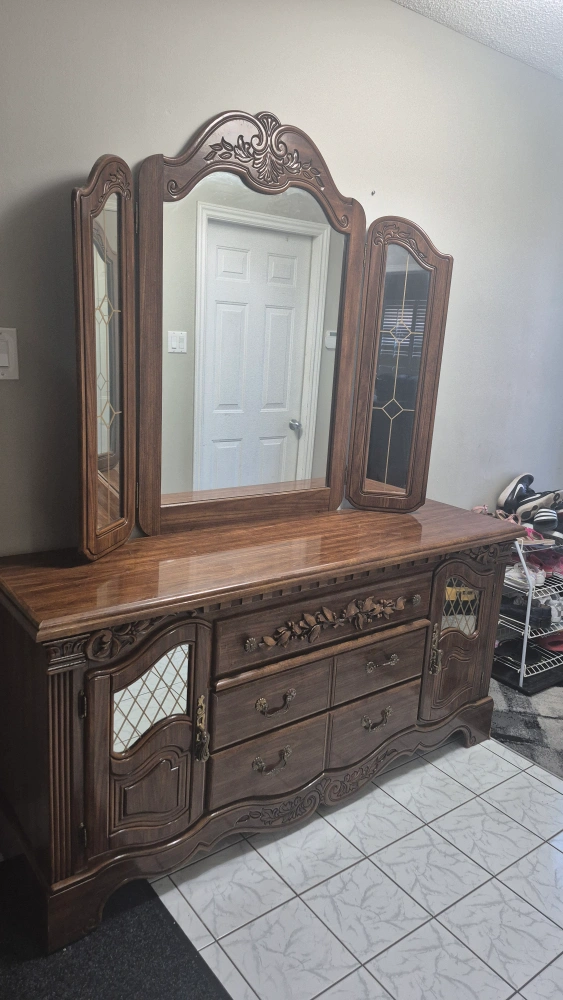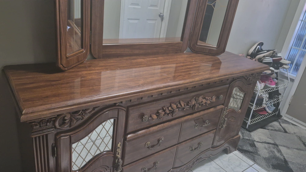 9Selling a beautiful antique wooden dresser with an attached mirror. It features ornate detailing and a classic design, perfect for adding a touch of elegance to any bedroom.