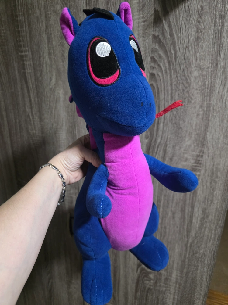 Selling a cute blue and pink dragon plush! It's in great condition and ready for a new home. Perfect for kids or anyone who loves dragons. Cat friendly home but kept in a storage bag the whole time.