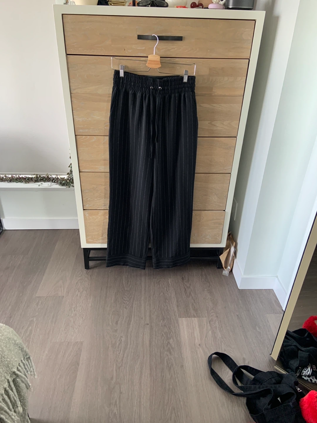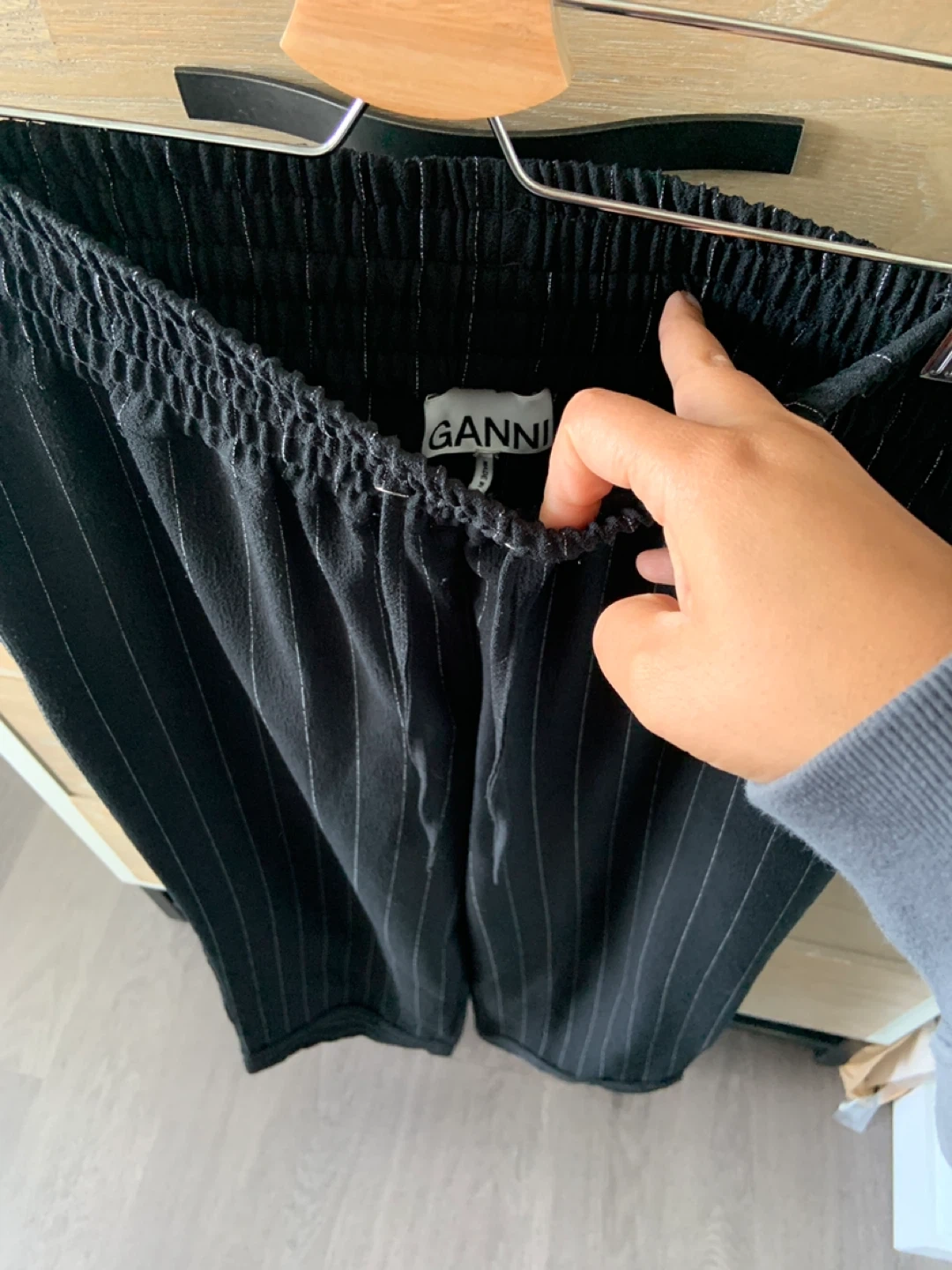 Selling a pair of Ganni wide leg pants. They are black with a subtle pinstripe. The pants have an elastic waistband for a comfortable fit. Great for a casual or dressed-up look!