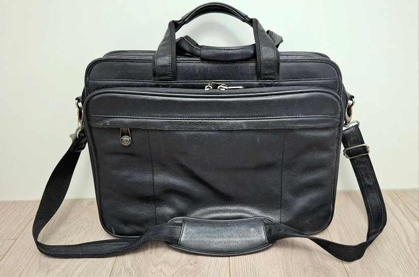 Black leather briefcase in good condition. It has a shoulder strap and multiple compartments for organization. Perfect for work or school!