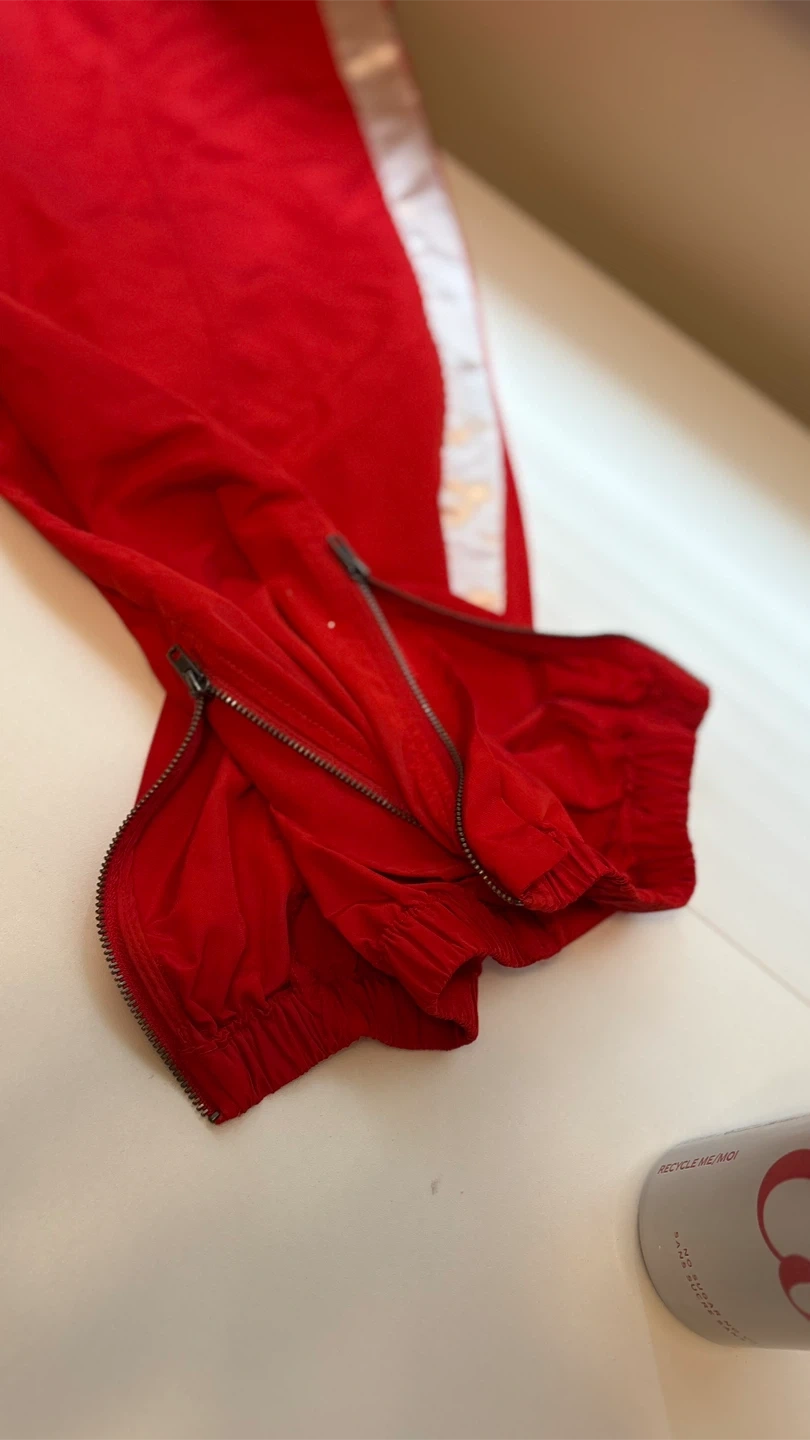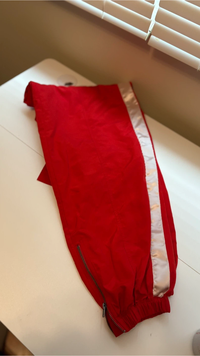 Selling a pair of bright red track pants from Future Collective in size XS or close to S. These pants feature a comfortable elastic waistband and stylish zippers at the ankles. Perfect for a pop of colour in your wardrobe!