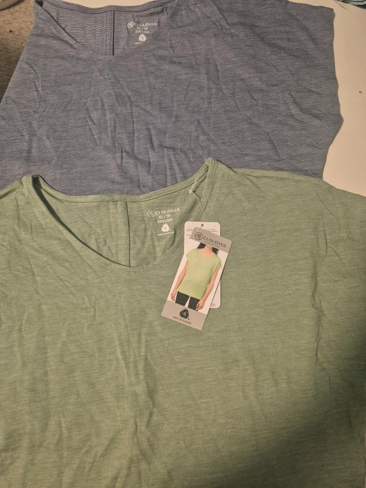 Two Cloudveil tops, both size XS/TP and new with tags! One is a lovely light green and the other is a striped blue. They are made of 100% merino wool, which is super soft and breathable!