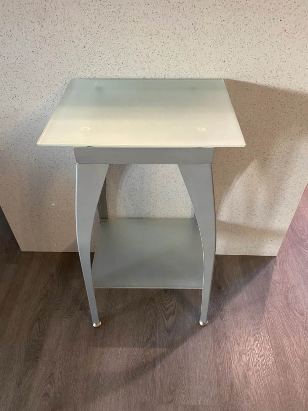 Selling a cute little side table with a glass top and a shelf underneath. It's in great shape and would be perfect for a small space or as a bedside table!