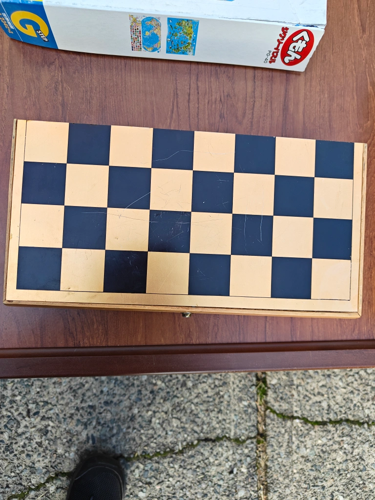 Giving away complete chess set! It comes with all the pieces, both black and white, neatly organized in a box. The board is also included, making it ready for a game right away. Perfect for anyone looking to learn!