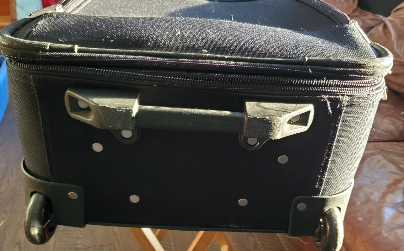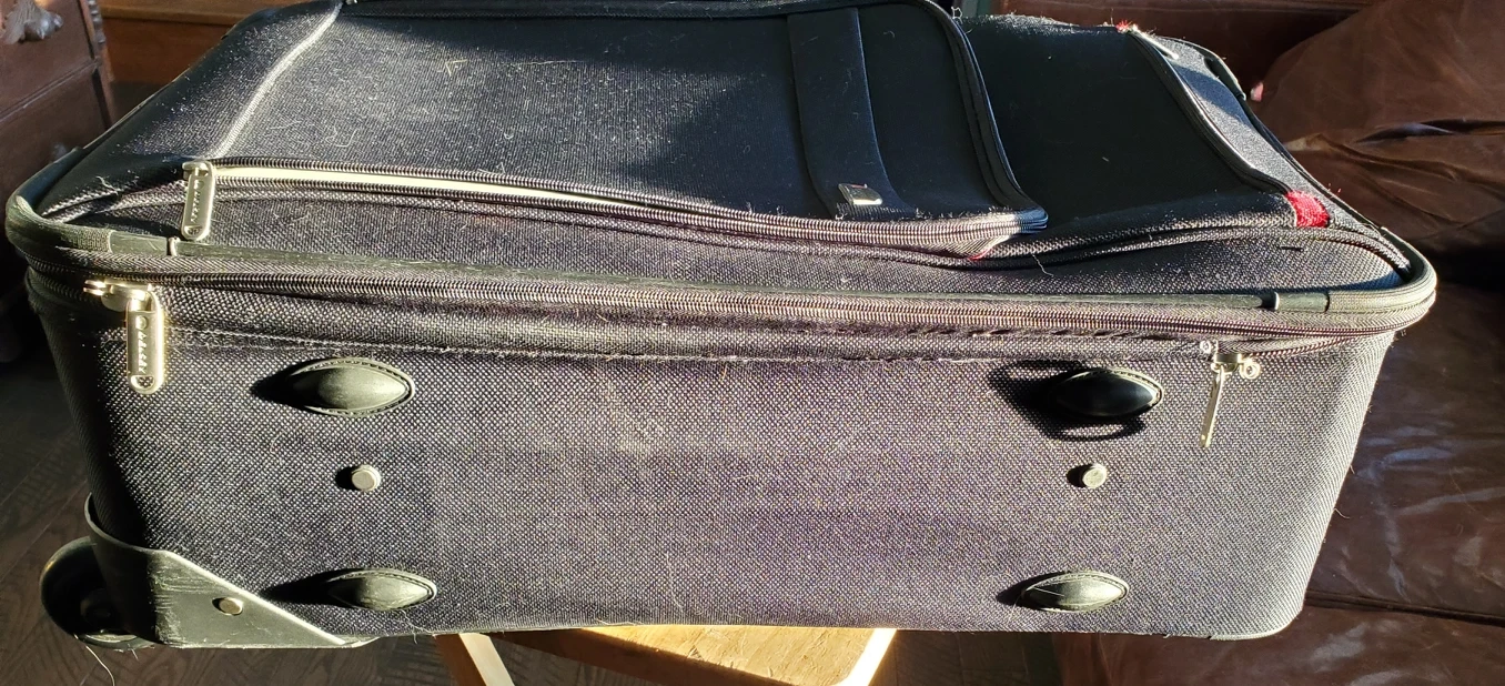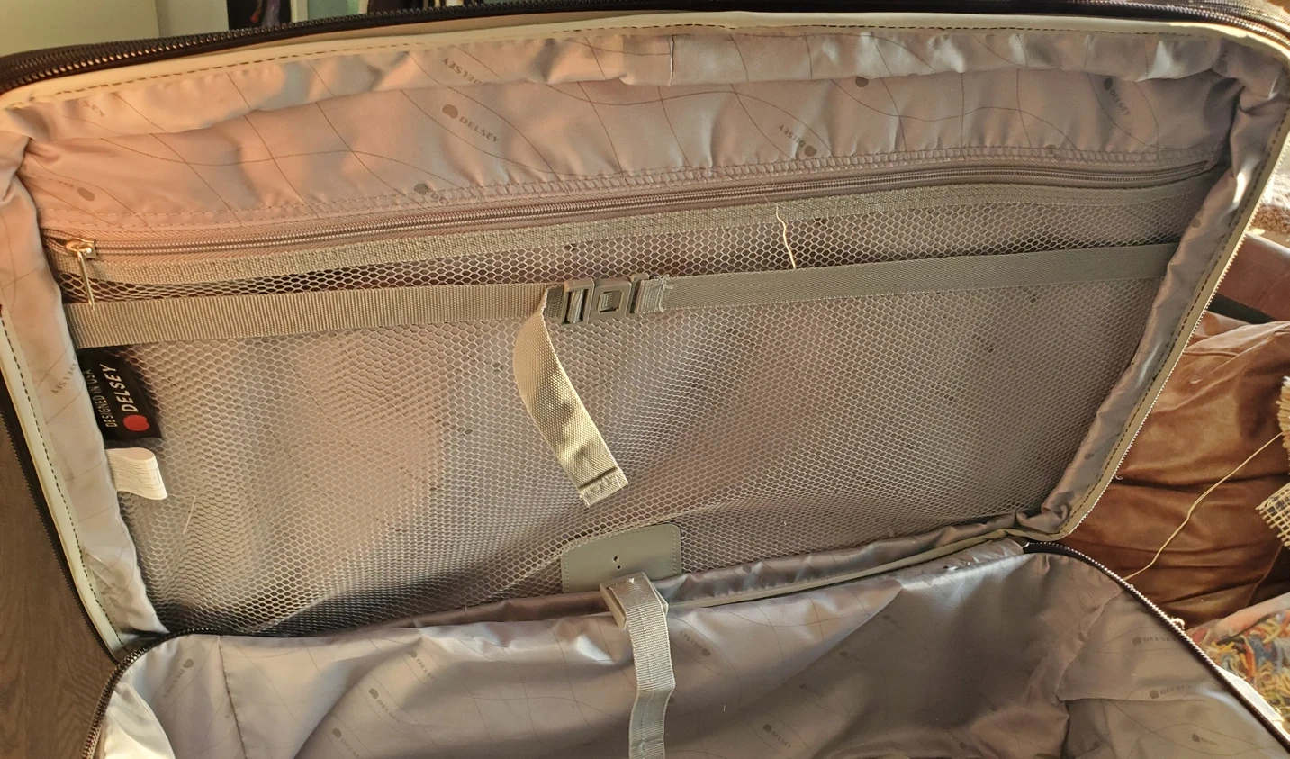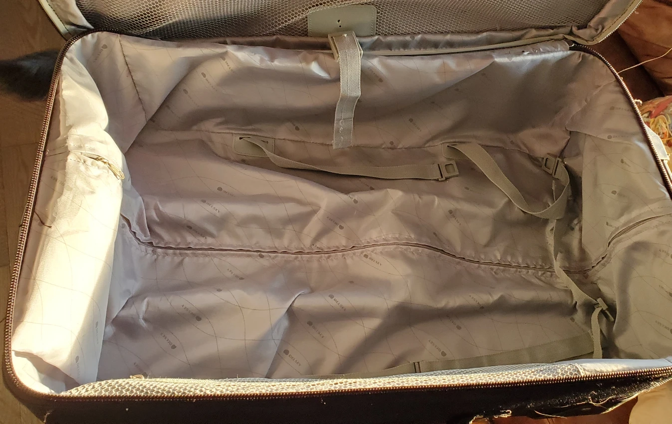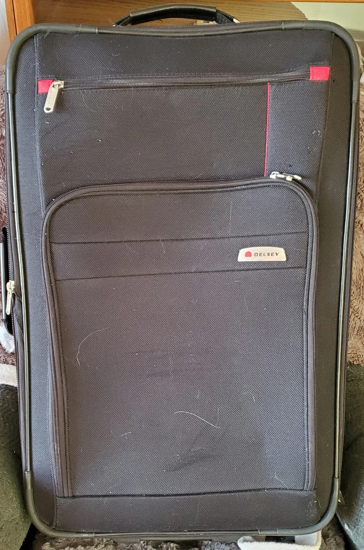 In beautiful like-new condition, Delsey mid-sized, soft sided black suitcase, two wheeled. Features inside address-holder with one lateral zippered pocket and zippered mesh pocket. The lining is made from 100% recycled material and has straps on the bottom. Exterior features multi position retractable handle to allow for comfortable height adjustment. Suitcase is soft sided for added durability and made with water repellent material. Retractable handle slides like new, wheels are silent with PVC protection between them. Suitcase also has two external pouches , all zippers function like new with Delsey 's famous patented zipsecuritech system. Suitcase is expandle and has large capacity for its size. Base and side of suitcase have protection feet. Well cared for and very gently used from non-smoking home. Dimensions are 60 cm tall x 24 cm deep x 40 cm wide