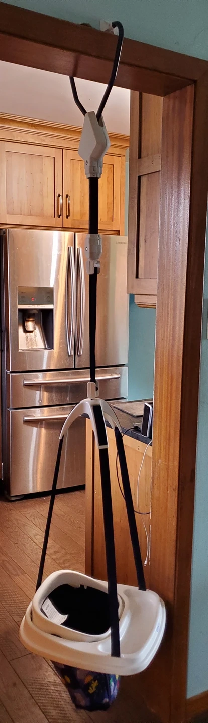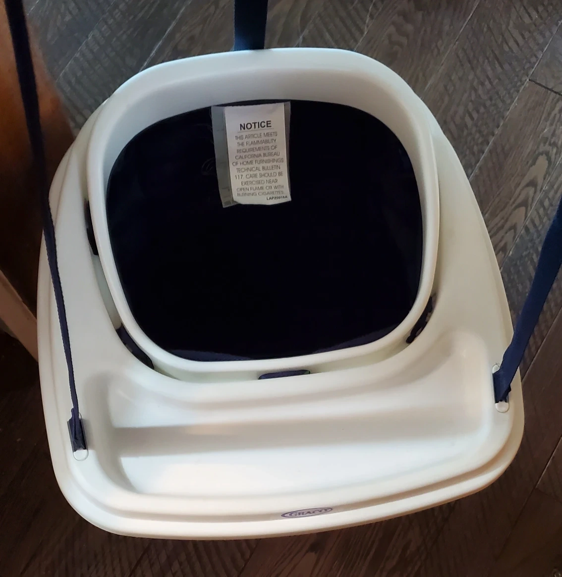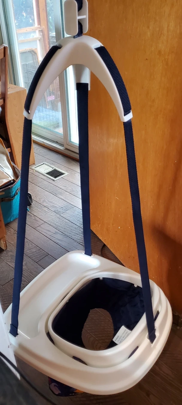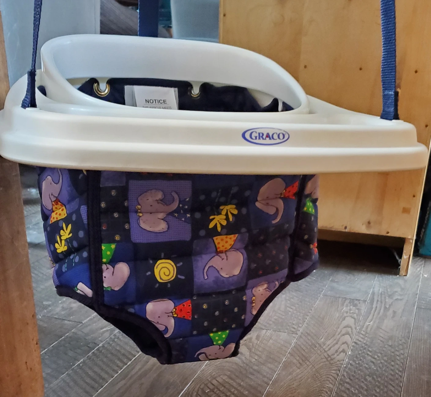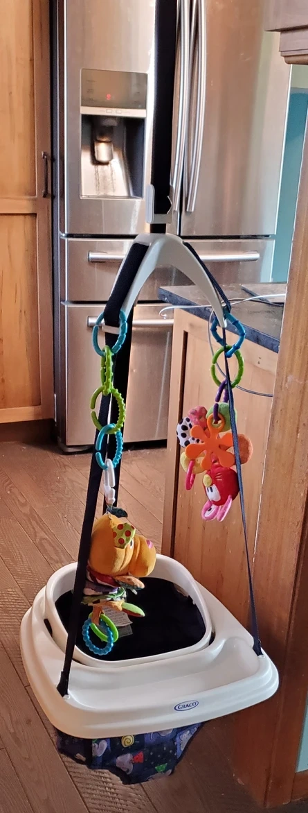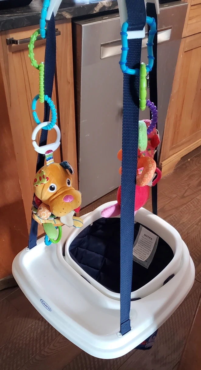 In like-new condition, very gently used and well cared for. Easy to transport, with a no-mark doorframe clamp, this action packed entertainer allows you to take baby from room to room so you can keep baby by your side.