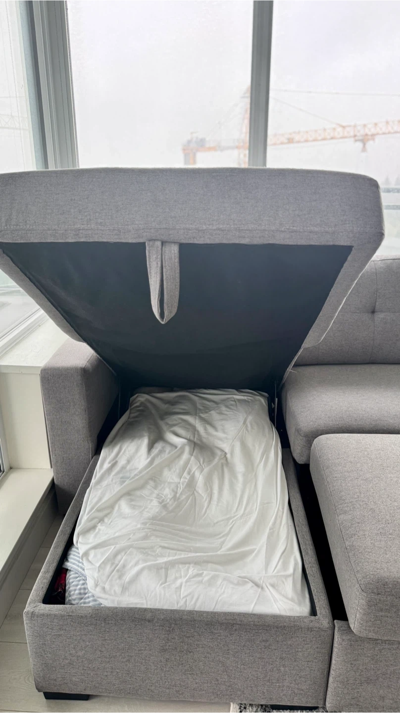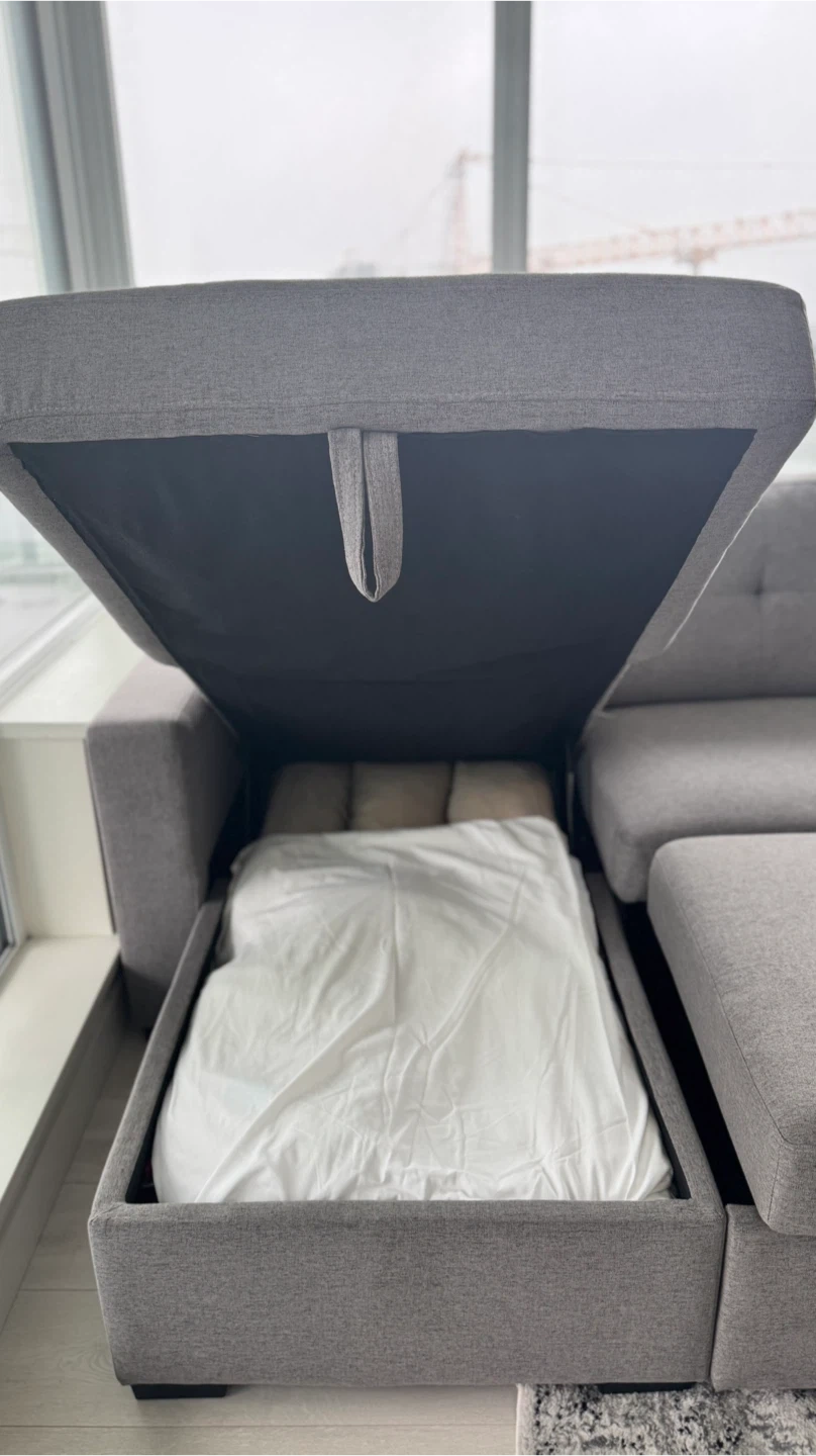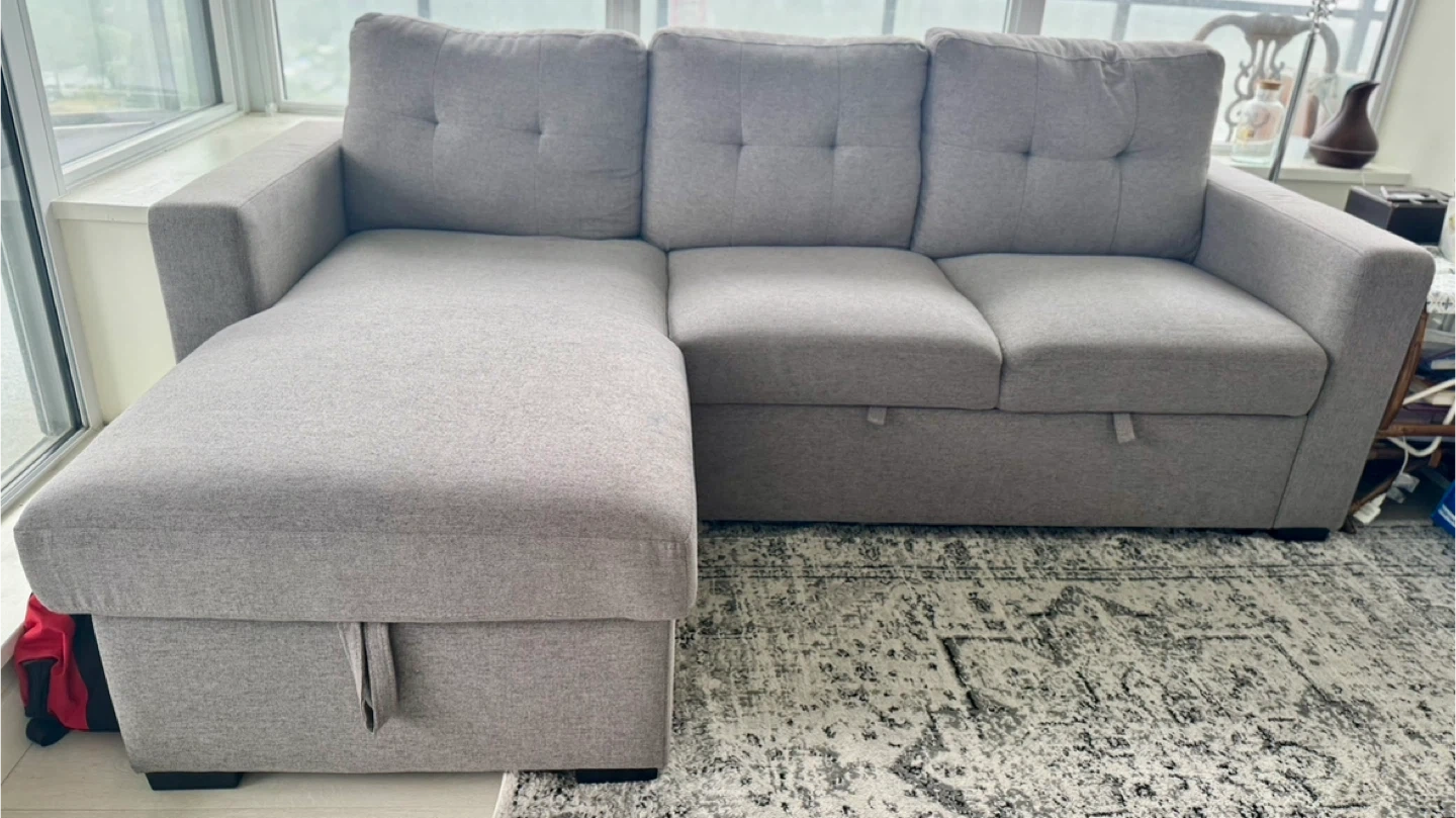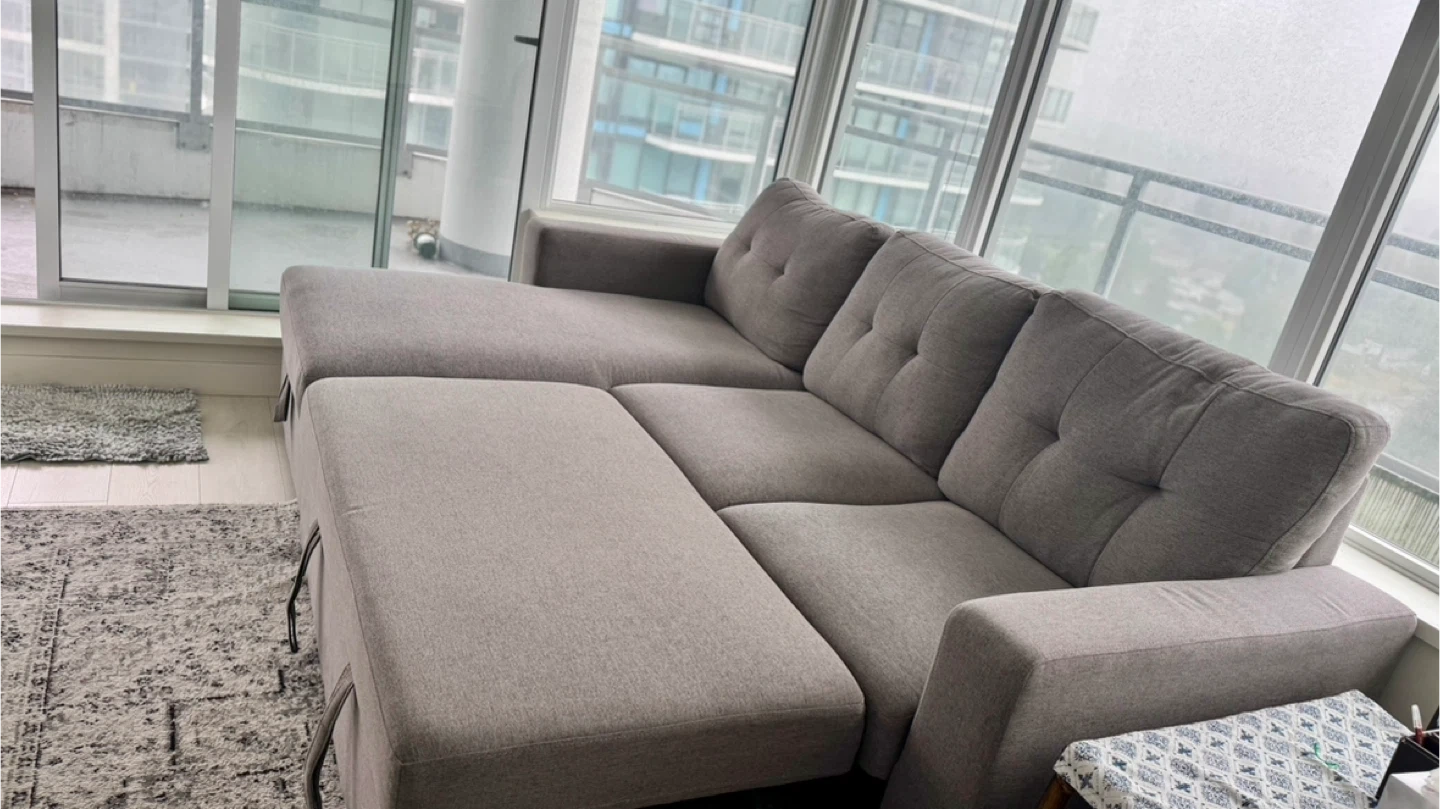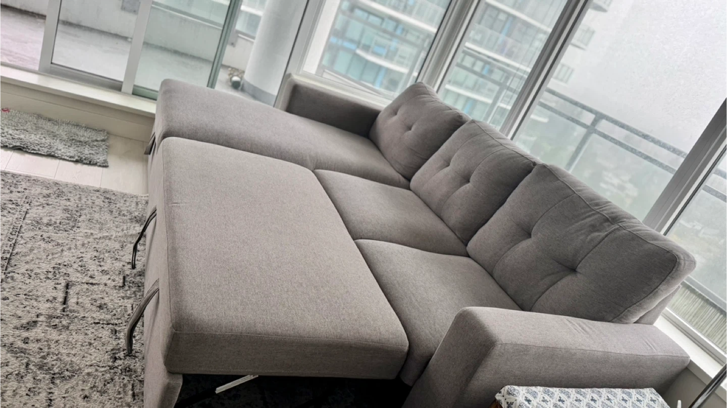 Modern grey sectional sofa in excellent condition, featuring a pull-out bed—perfect for your living room or guest space. Stylish button-tufted cushions give it a sleek, contemporary look.