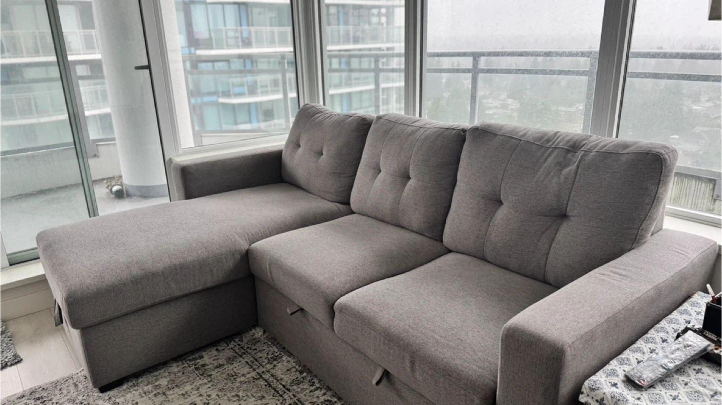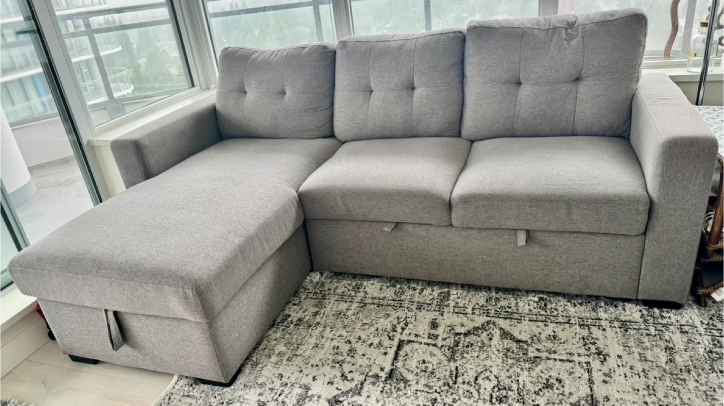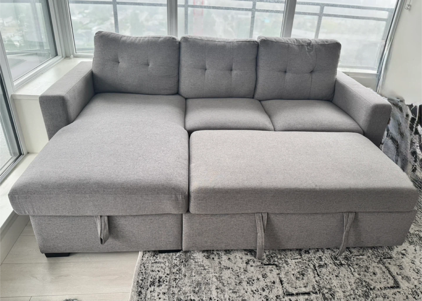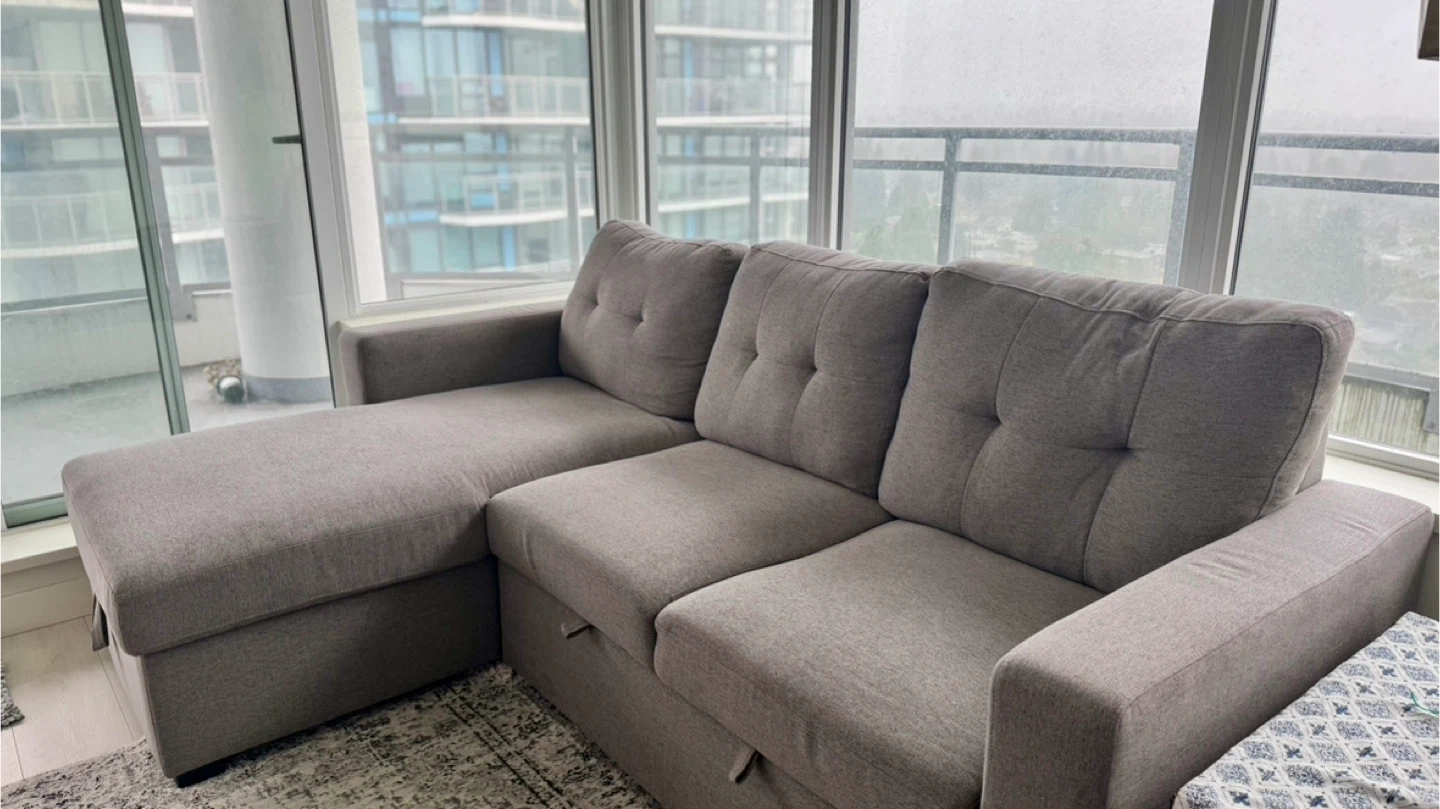 Modern grey sectional sofa in excellent condition, featuring a pull-out bed—perfect for your living room or guest space. Stylish button-tufted cushions give it a sleek, contemporary look.