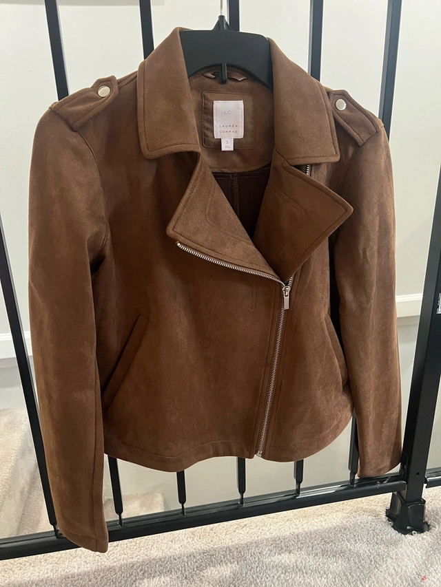 113Brand: Lauren Conrad Size: Small (4-6) Material: 92% Polyester, 8% Spandex Colour: Brown Style: Moto/Biker Never worn