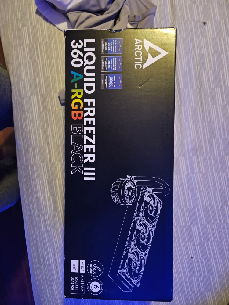 Selling an Arctic Liquid Freezer III 360 A-RGB Black CPU cooler. It's in great condition and comes with all the original components including: - Liquid Freezer III 360 A-RGB (Black) x1 - PWM Cable (Individual Control) x1 - PWM Cable (All-In-One) x1 - MX-6 0.8 g x1 - Intel Mounting Set x1 - AMD Mounting Set x1 It supports LGA1851, LGA1700, AMD5, and AM4 sockets. Tubing length is 450 mm and the radiator dimensions are 398 L x 120 W x 38 H mm