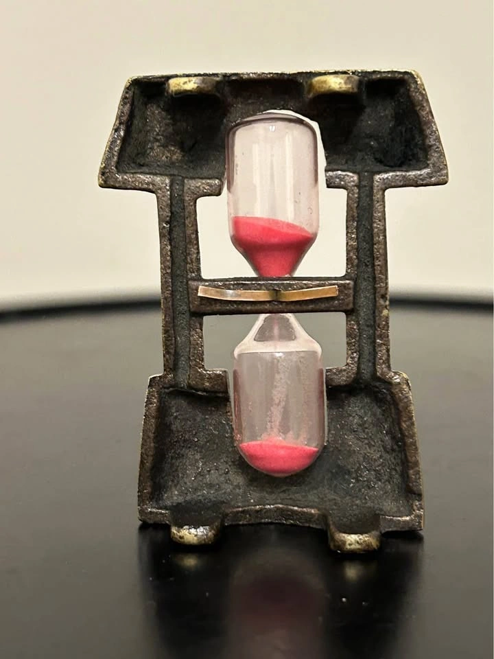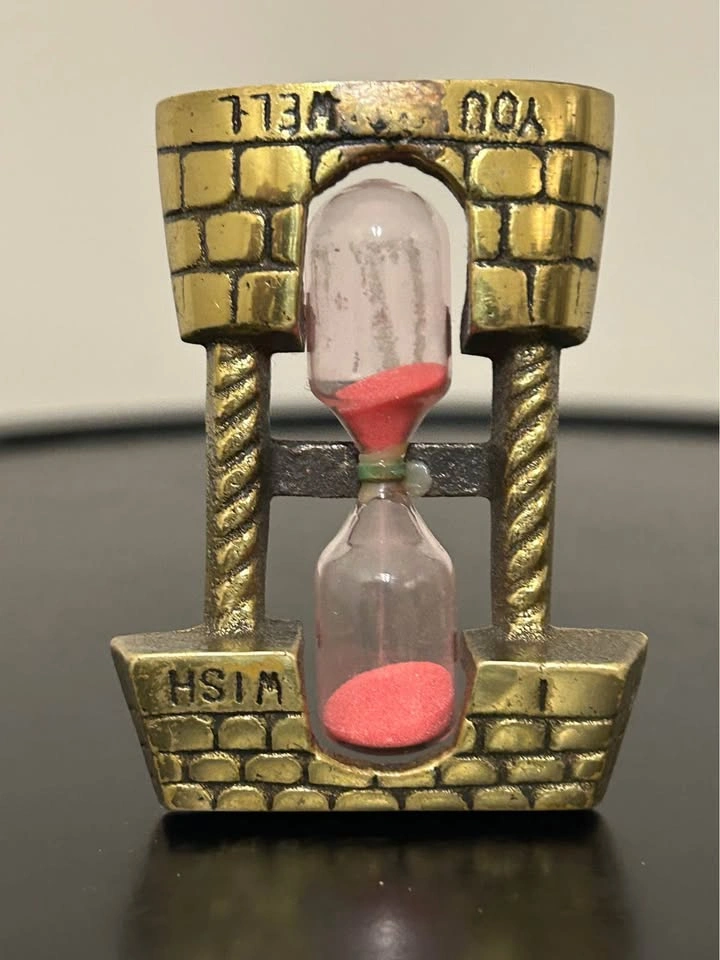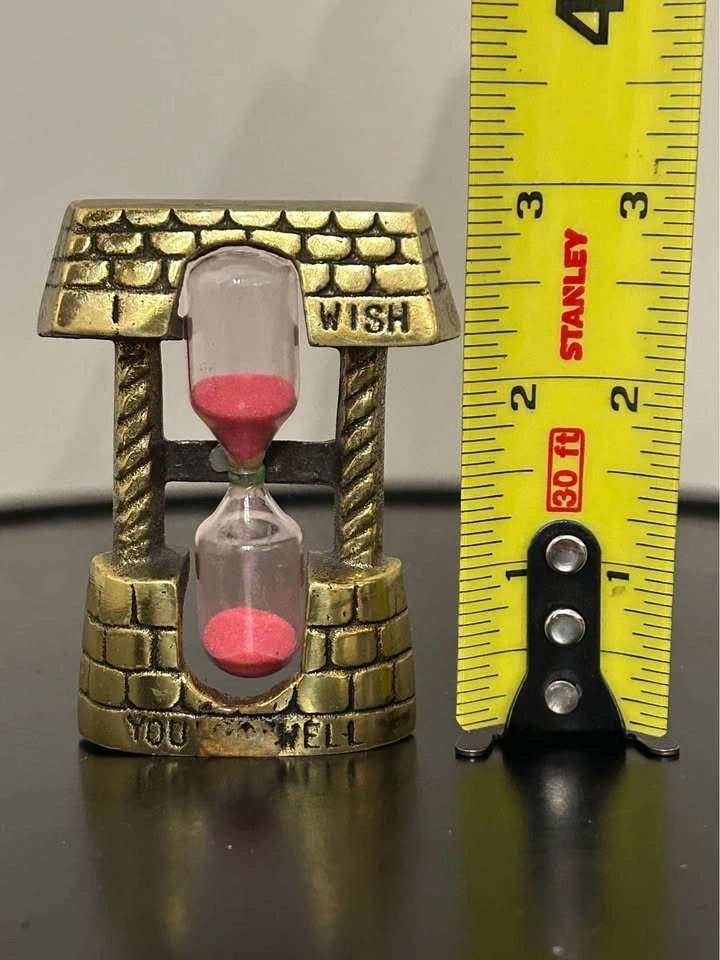 Charming vintage brass miniature hourglass shaped like a wishing well. Features embossed text “I WISH YOU WELL” and red sand inside glass tubes. Beautiful decorative piece or good-luck charm. Approx. height: 3 inches. Solid and nicely detailed casting, with natural patina from age. Perfect for display on a desk, shelf, or as part of a vintage collection. Pick up: Seton area, Calgary. See also my other lots. Open to your questions and suggestions. If necessary, I provide additional photos. These are not new things, so please look carefully at the photos and videos. Sizes are submitted on request and also using a tape measure in the photo.