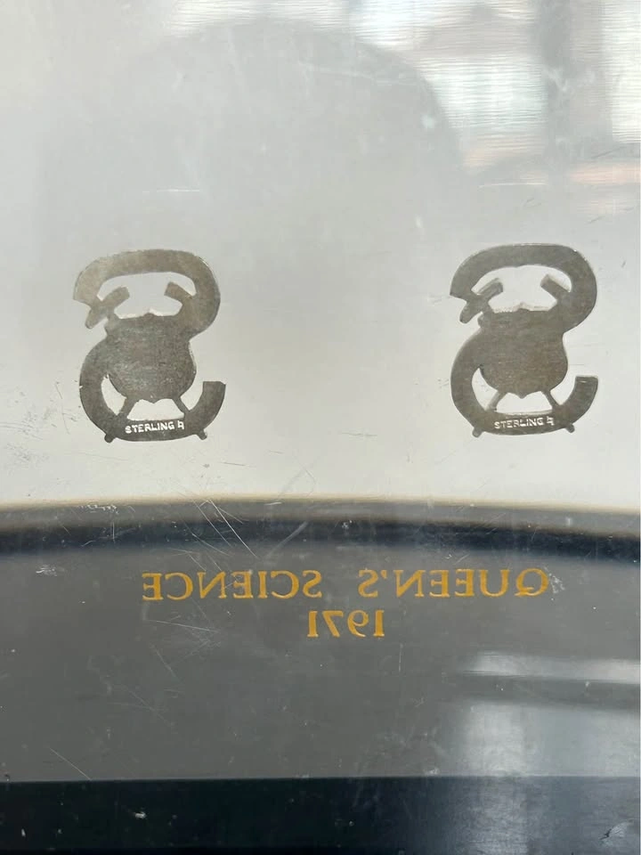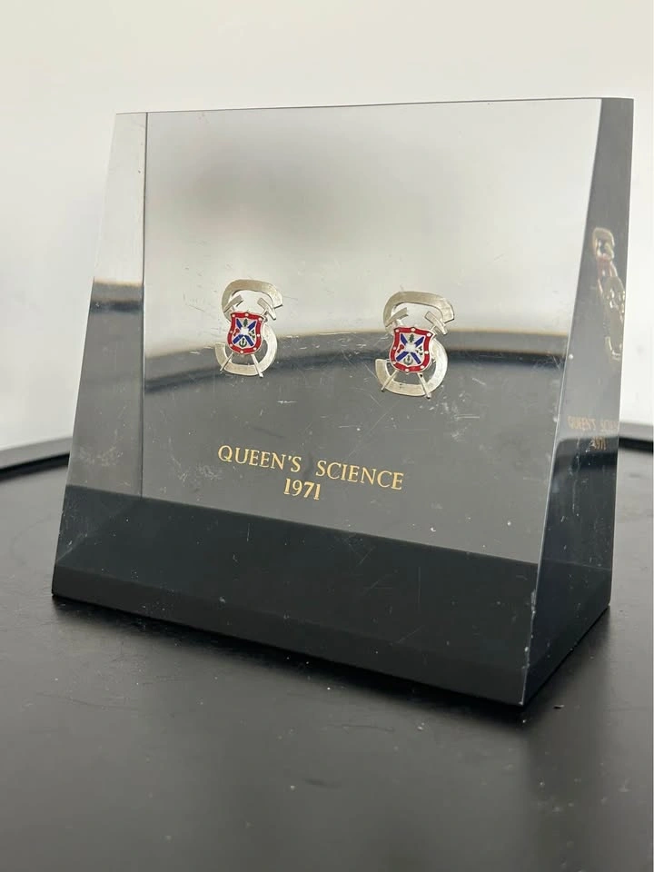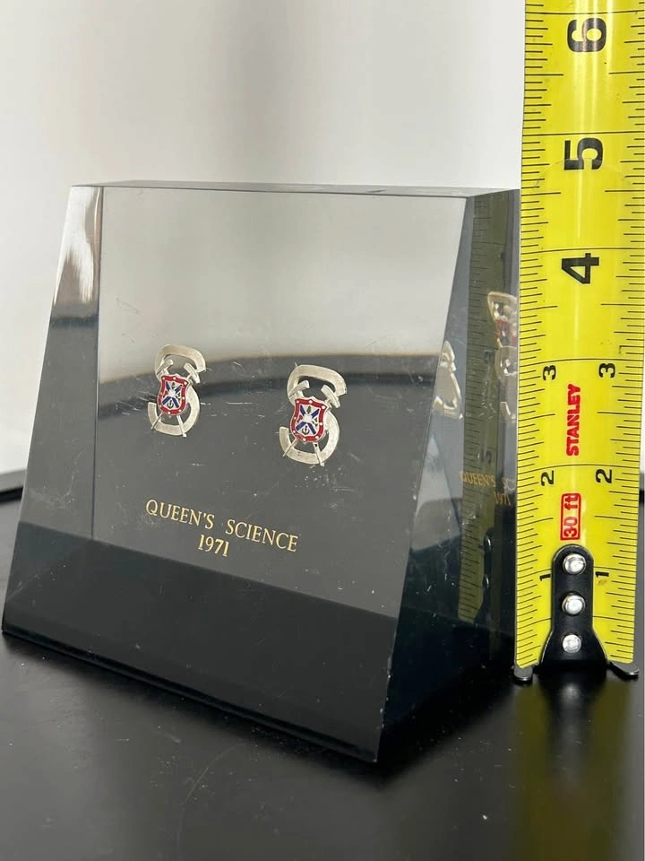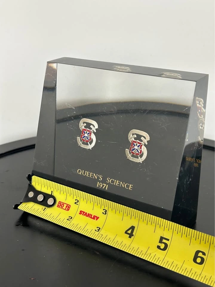 Rare vintage Queen’s University Science (Engineering & Applied Science) display piece from 1971. Features two sterling silver and enamel crests embedded in a clear Lucite block with gold lettering “Queen’s Science 1971.” Each crest is marked “STERLING.” A unique collectible for Queen’s University alumni, Canadian academic memorabilia collectors, or mid-century Lucite art enthusiasts. Good vintage condition with light surface marks consistent with age. Pick up in the Seton area, Calgary. See also my other lots. Open to your questions and suggestions. If necessary, I provide additional photos. These are not new things, so please look carefully at the photos and videos. Sizes are submitted on request and also using a tape measure in the photo.