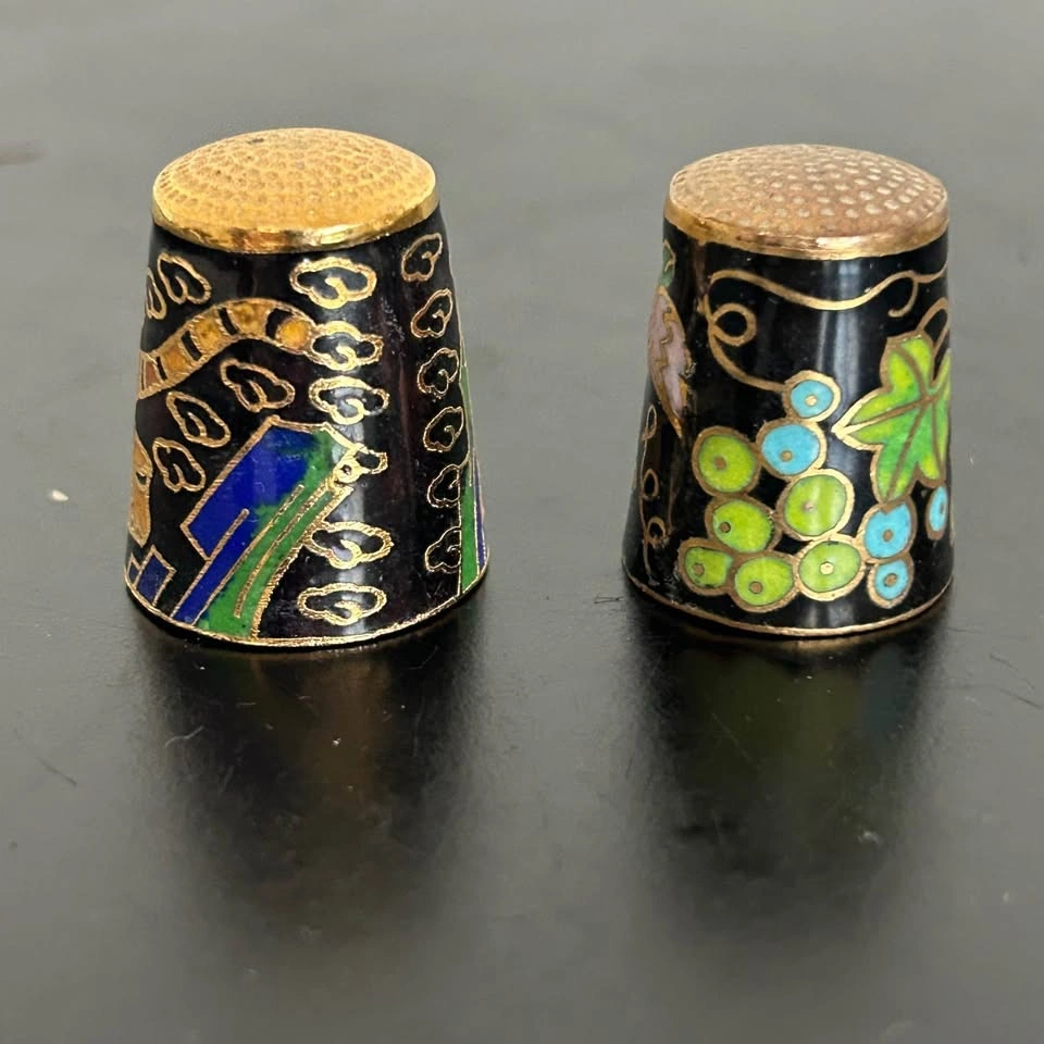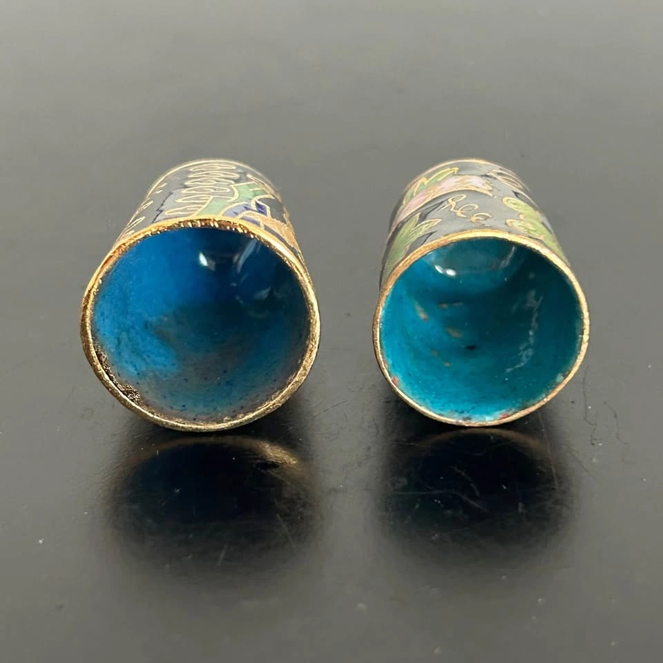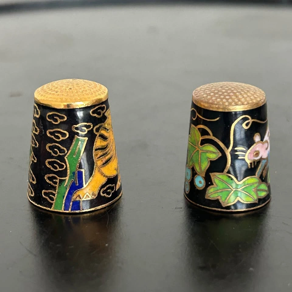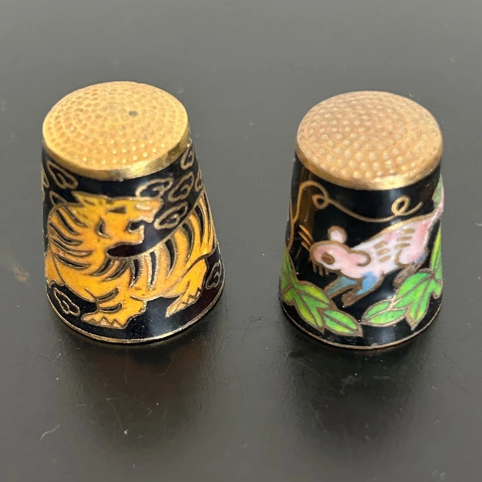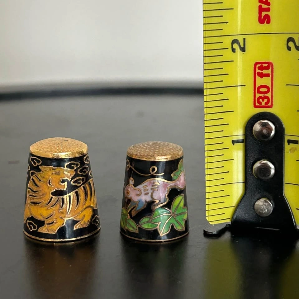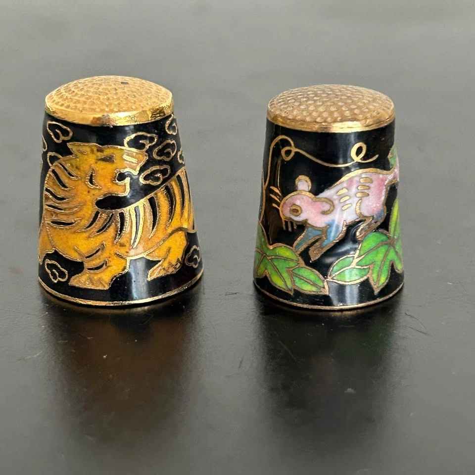 Beautiful pair of vintage cloisonné enamel thimbles featuring tiger and rat designs from the Chinese zodiac. Made of brass with colorful hand-filled enamel and classic turquoise interiors. Fine craftsmanship and vivid details on black background. Collectible decorative thimbles, perfect for sewing enthusiasts or Oriental art collectors. Pick up: Seton area, Calgary. See also my other lots. Open to your questions and suggestions. If necessary, I provide additional photos. These are not new things, so please look carefully at the photos and videos. Sizes are submitted on request and also using a tape measure in the photo.