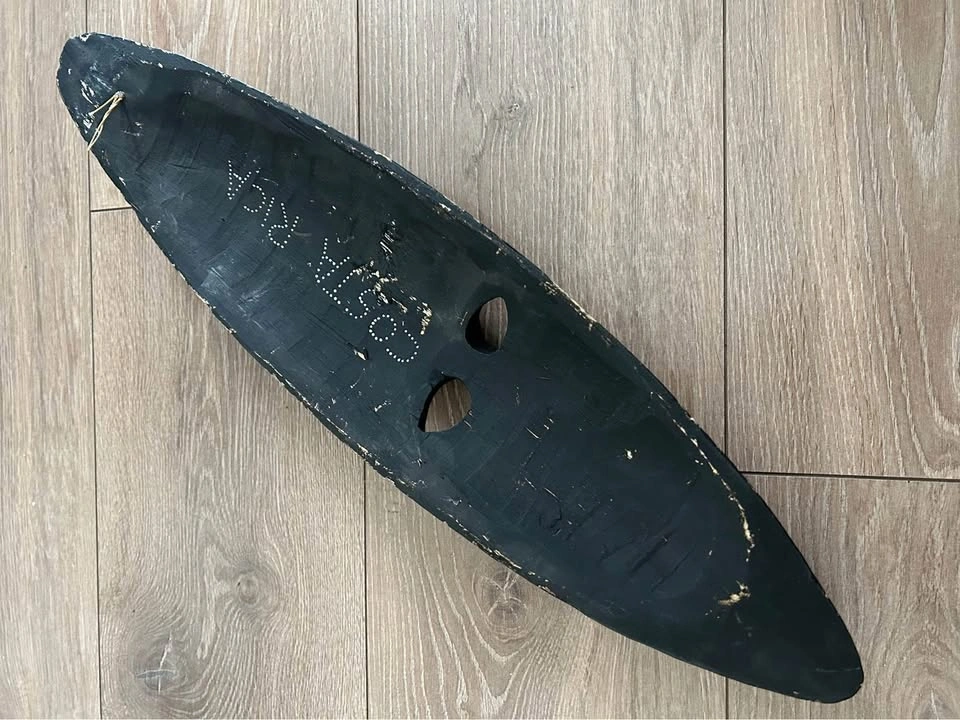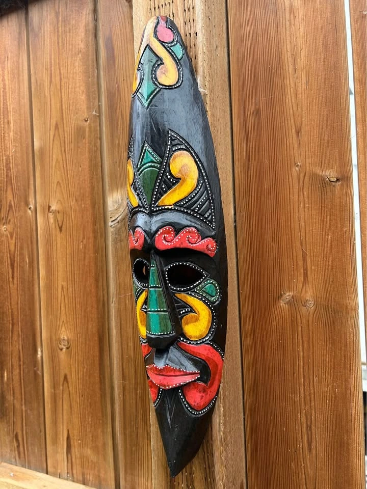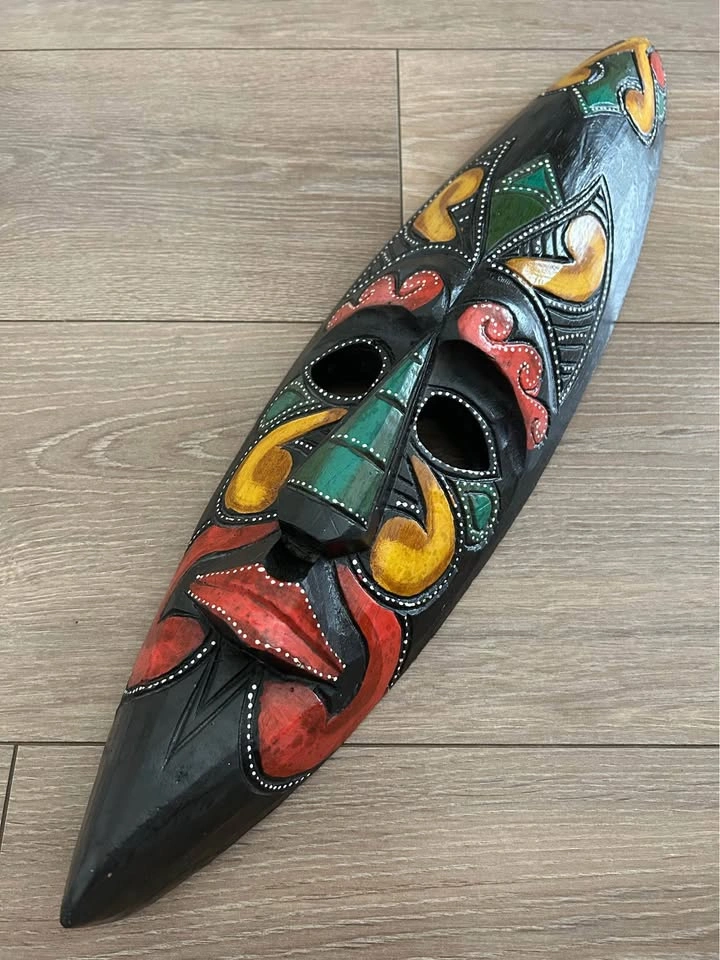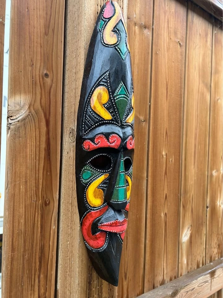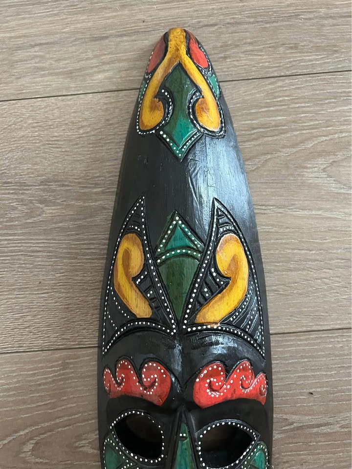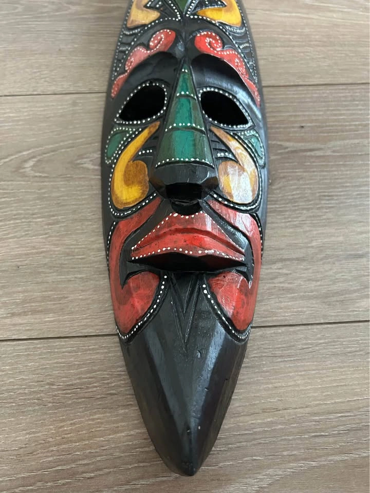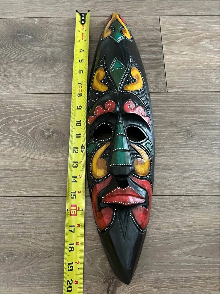 Vibrant hand-carved wooden mask from Costa Rica, featuring bold tribal-inspired patterns in red, yellow, and green. Each color and curve is carefully detailed with fine dotted accents, reflecting traditional Latin American folk art. A striking wall piece that brings warmth, culture, and personality to any interior or art collection. Pick up: Seton area, Calgary. See also my other lots. Open to your questions and suggestions. If necessary, I provide additional photos. These are not new things, so please look carefully at the photos and videos. Sizes are submitted on request and also using a tape measure in the photo.