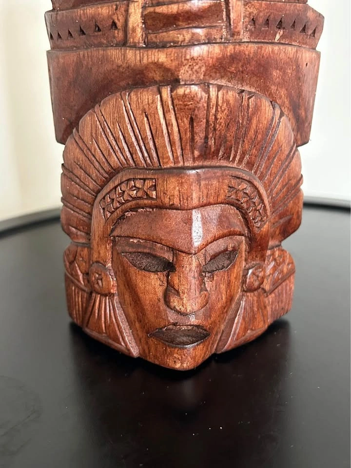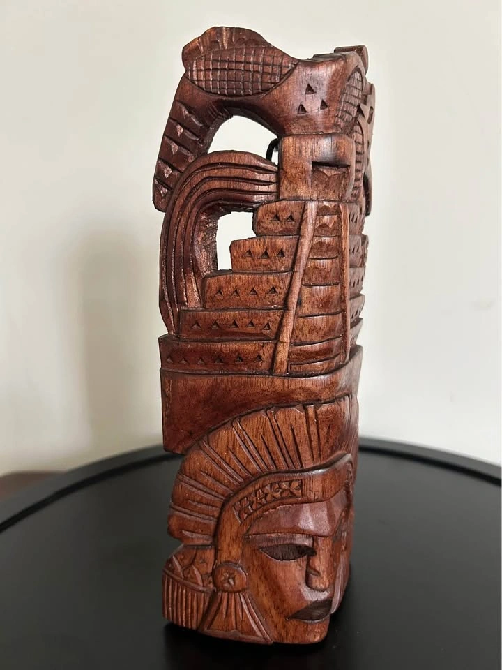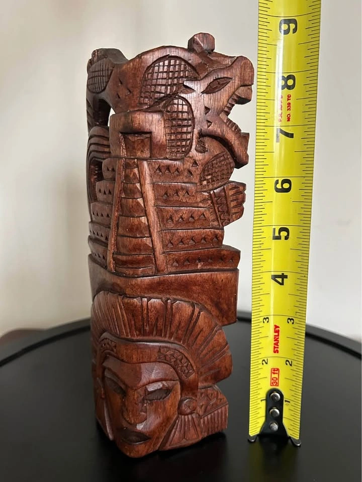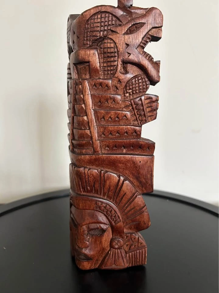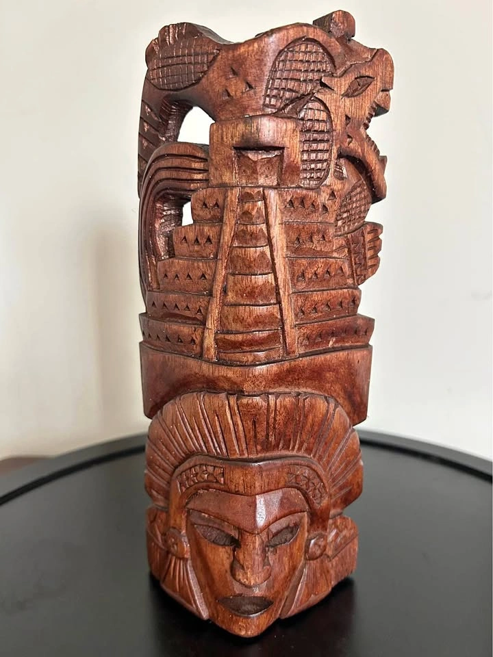 Beautiful hand-carved wooden sculpture from the Maya Riviera, Mexico (signed on the back). The carving features a traditional Mayan face beneath the Chichen Itza pyramid, crowned with the feathered serpent Quetzalcoatl. Made from richly toned hardwood, this detailed piece reflects authentic Mexican folk craftsmanship and cultural symbolism. A striking display item or thoughtful gift for collectors of indigenous art. Pick up: Seton area, Calgary. See also my other lots. Open to your questions and suggestions. If necessary, I provide additional photos. These are not new things, so please look carefully at the photos and videos. Sizes are submitted on request and also using a tape measure in the photo.