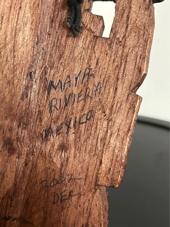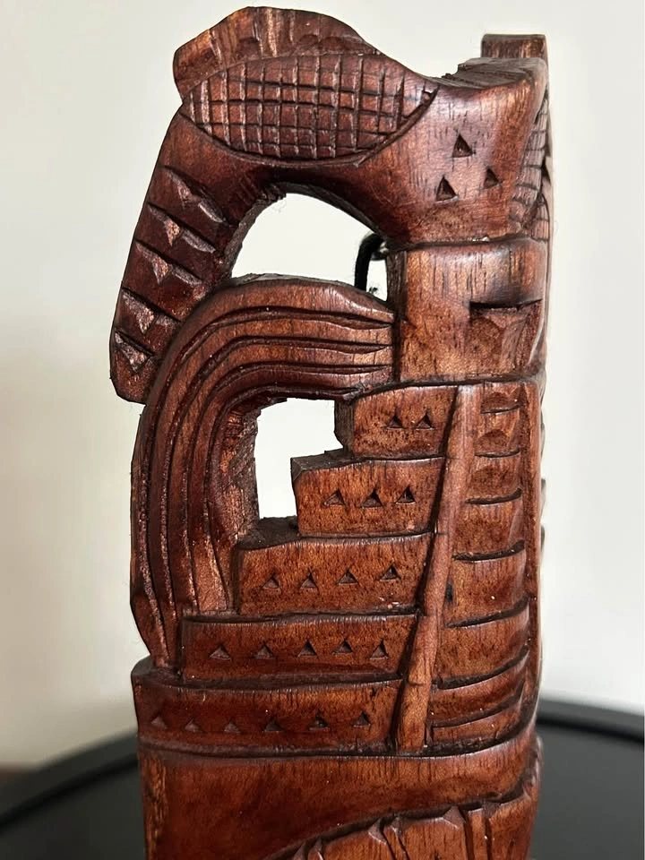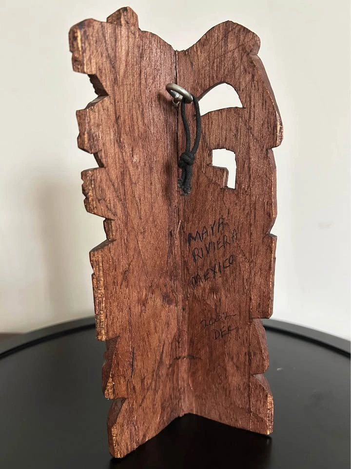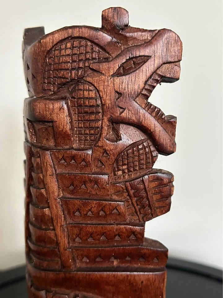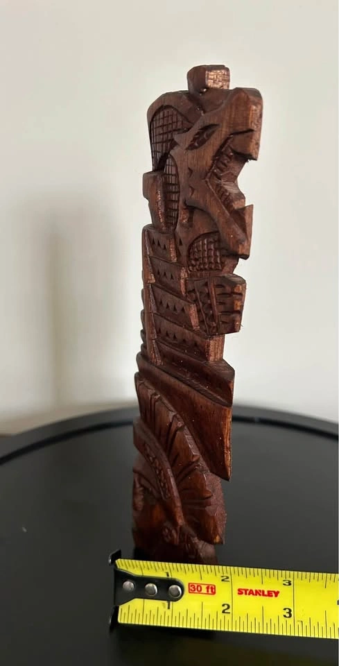 Beautiful hand-carved wooden sculpture from the Maya Riviera, Mexico (signed on the back). The carving features a traditional Mayan face beneath the Chichen Itza pyramid, crowned with the feathered serpent Quetzalcoatl. Made from richly toned hardwood, this detailed piece reflects authentic Mexican folk craftsmanship and cultural symbolism. A striking display item or thoughtful gift for collectors of indigenous art. Pick up: Seton area, Calgary. See also my other lots. Open to your questions and suggestions. If necessary, I provide additional photos. These are not new things, so please look carefully at the photos and videos. Sizes are submitted on request and also using a tape measure in the photo.