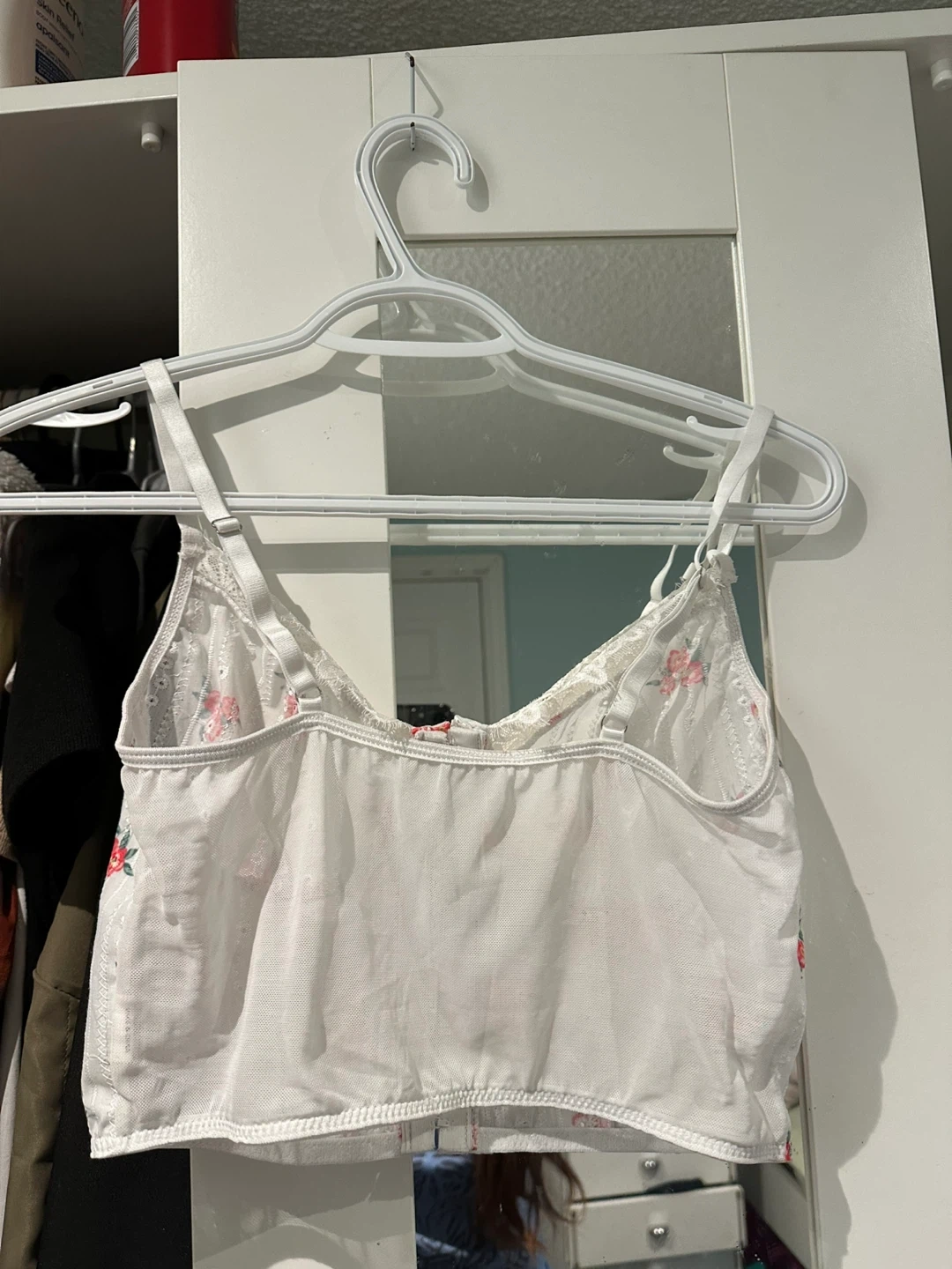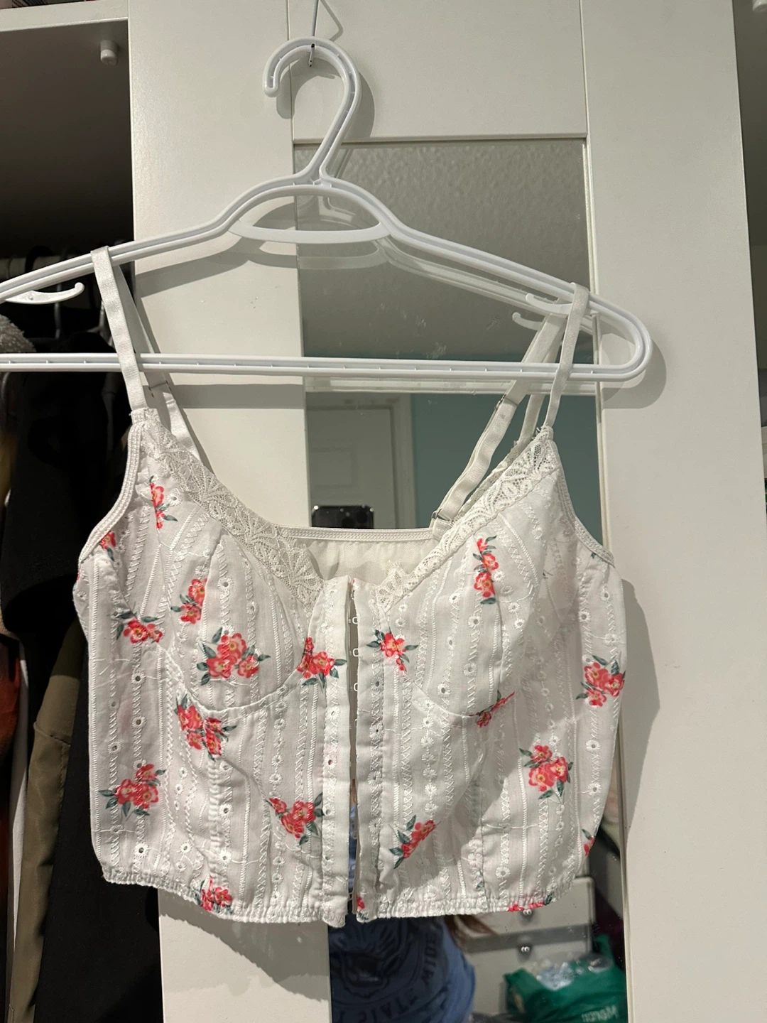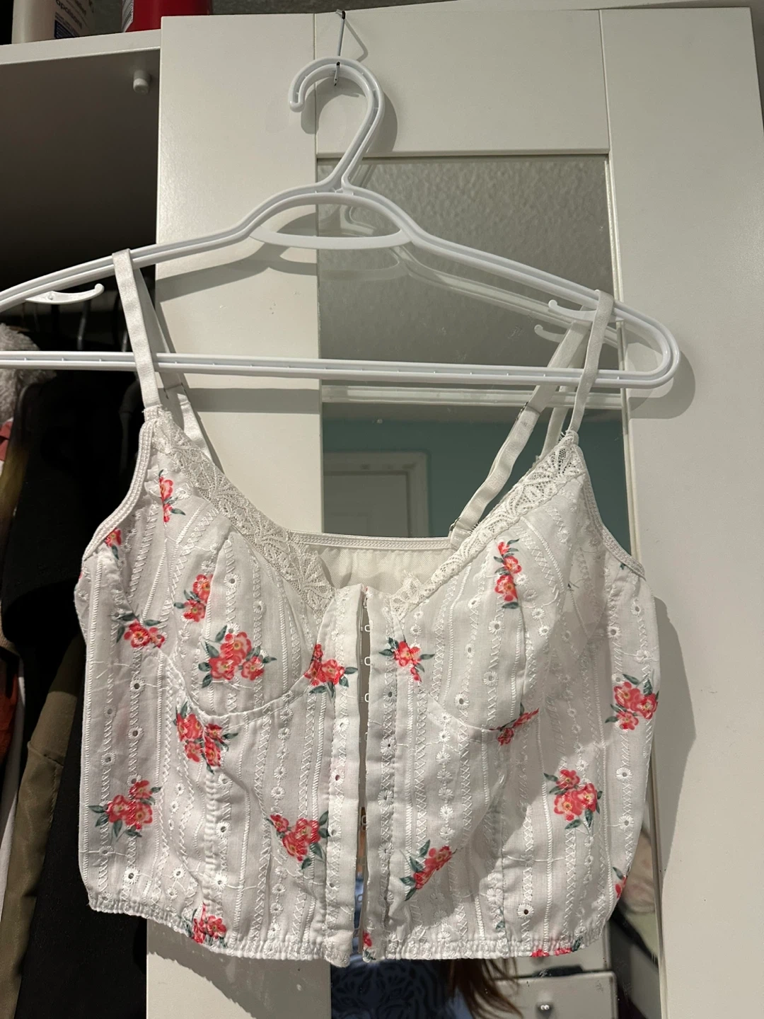 Selling a cute white corset top with a floral pattern! It's in great condition and would be a lovely addition to any wardrobe. Perfect for a sunny day out or a casual evening with friends