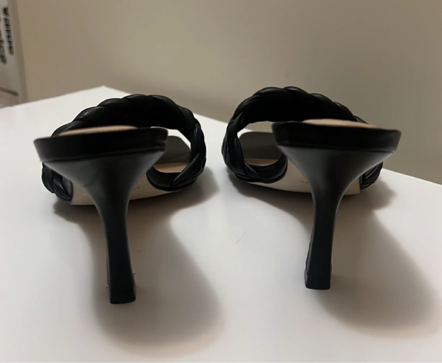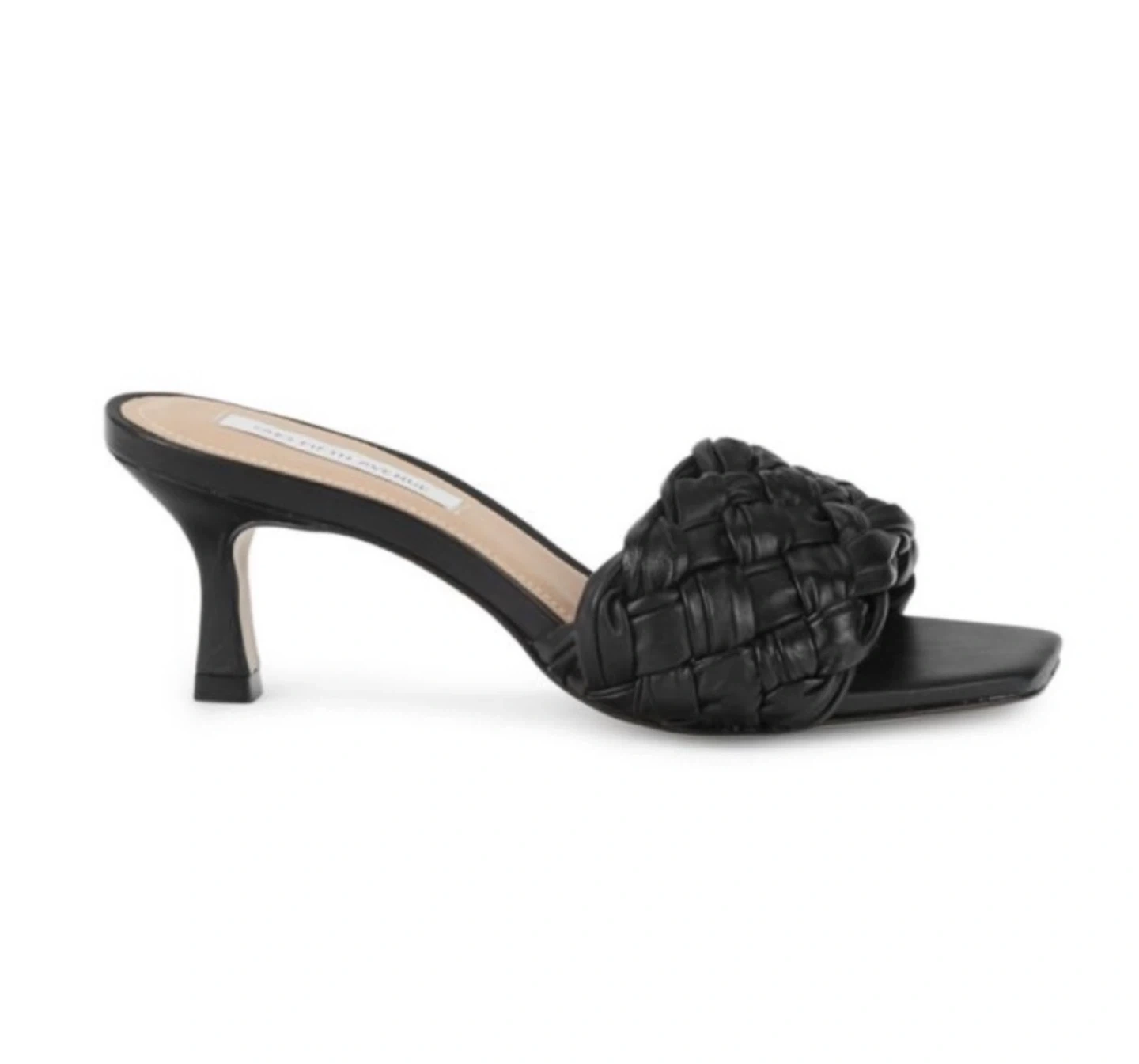 These are a stylish pair of black woven heeled mules from Saks Fifth Avenue. They have a unique woven design on the upper and a sleek heel. Perfect for dressing up or down! Size 7.5 but like 8
