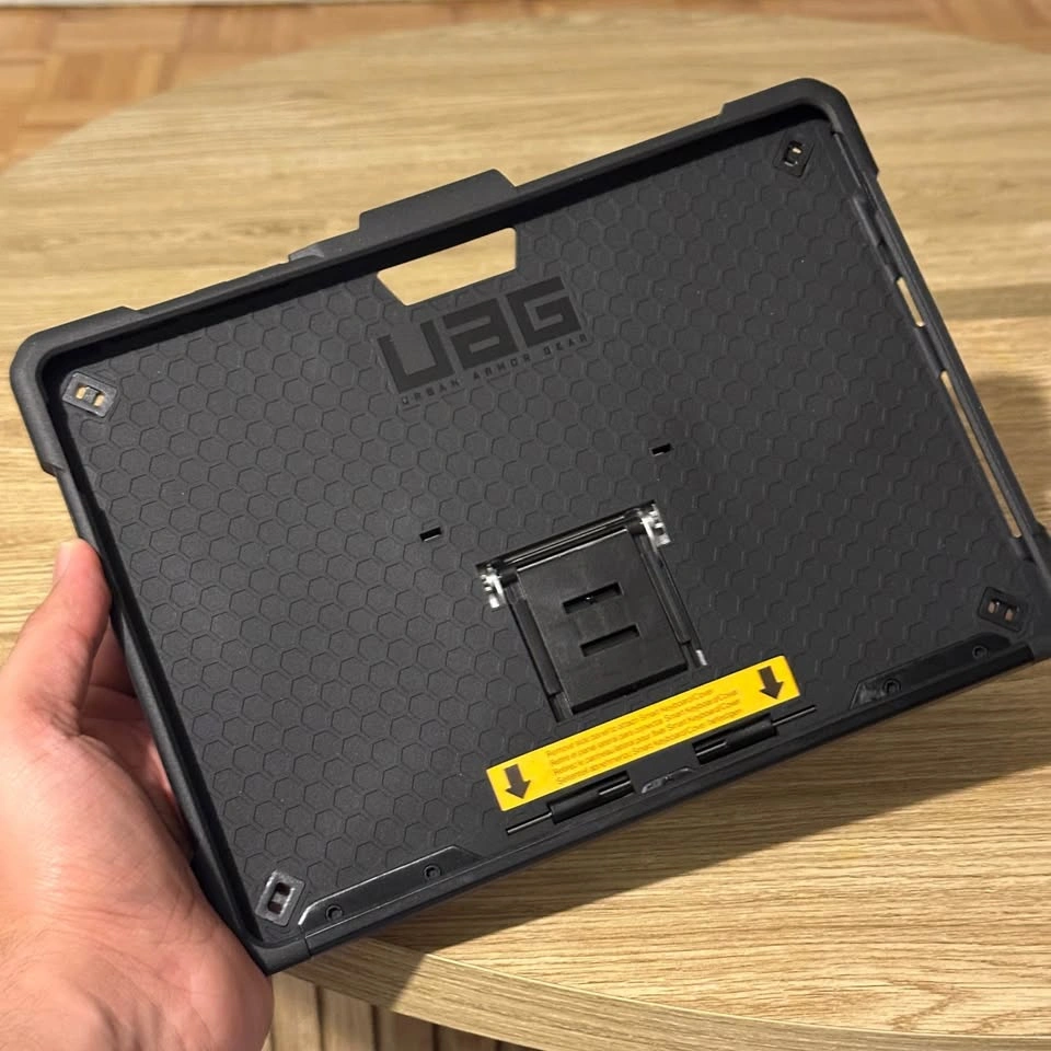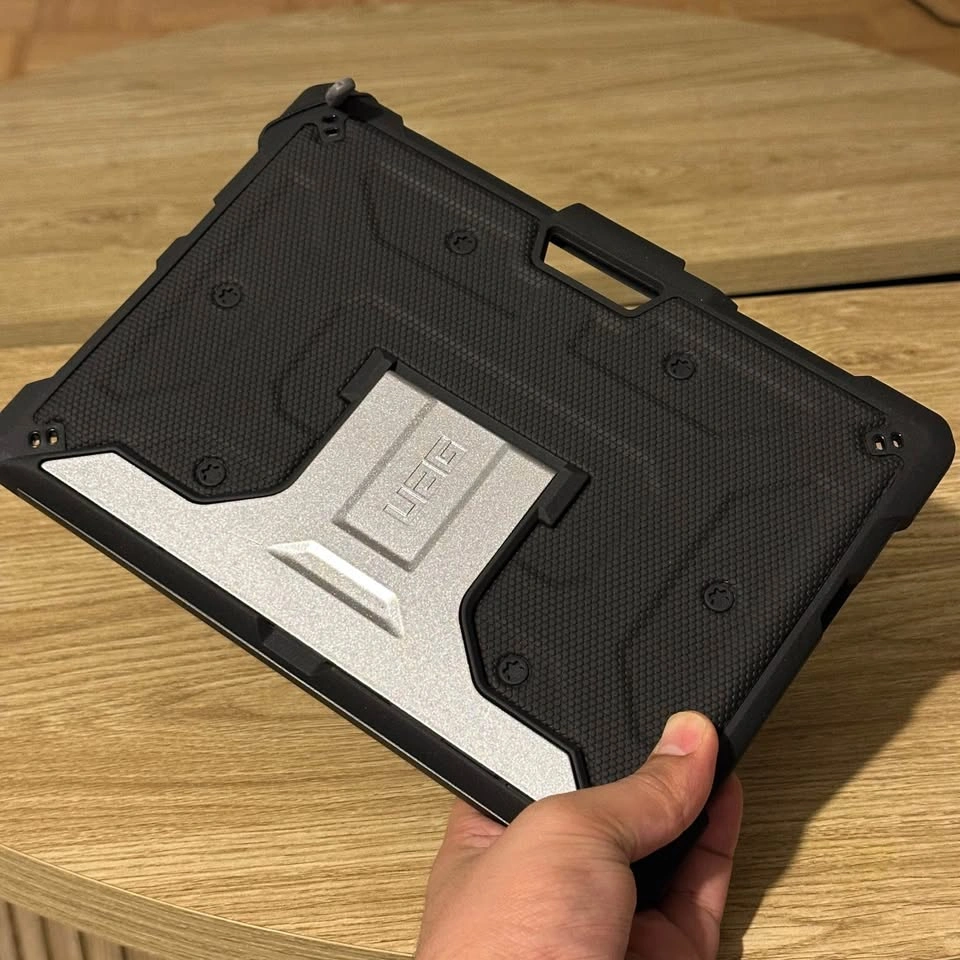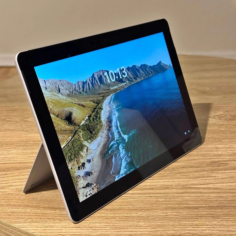 Microsoft Surface Go tablet with rugged case. Plush Platinum colour. Windows operating system.