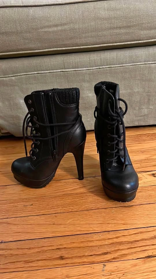 These beautiful black lace up boots are in great conditions, worn only once, soles are practically new, inside label completely visible, zippers work perfectly, no scratches on the leather. They go perfect with skirts, jeans or leggings; perfect for winter, spring or fall. It’s a great deal!
