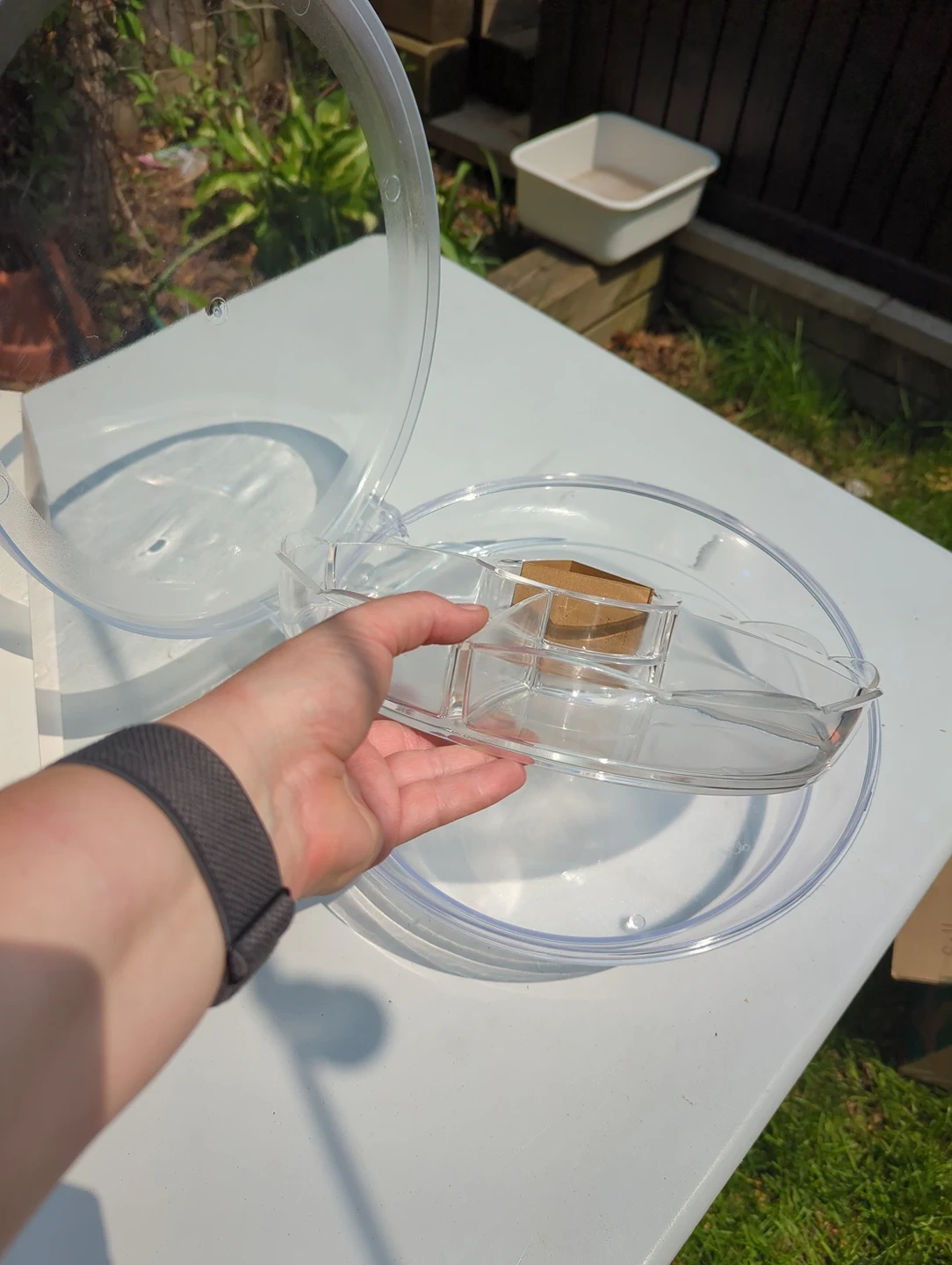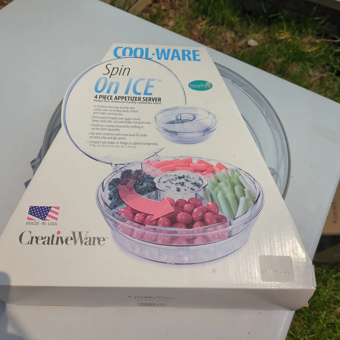 This has a built in cover and tray underneath for ice with a 4 piece appetizer tray with dip bowl in the centre. it was a gift and I haven't had enough big parties to make it useful for me. Maybe some of you have great plans for it... Retails in the $40 range. Get ready for your next party 🎉
