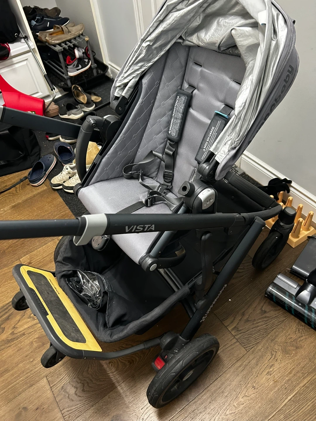 Selling an Uppababy Vista stroller! It comes with the piggyback board and bassinet attachment.
