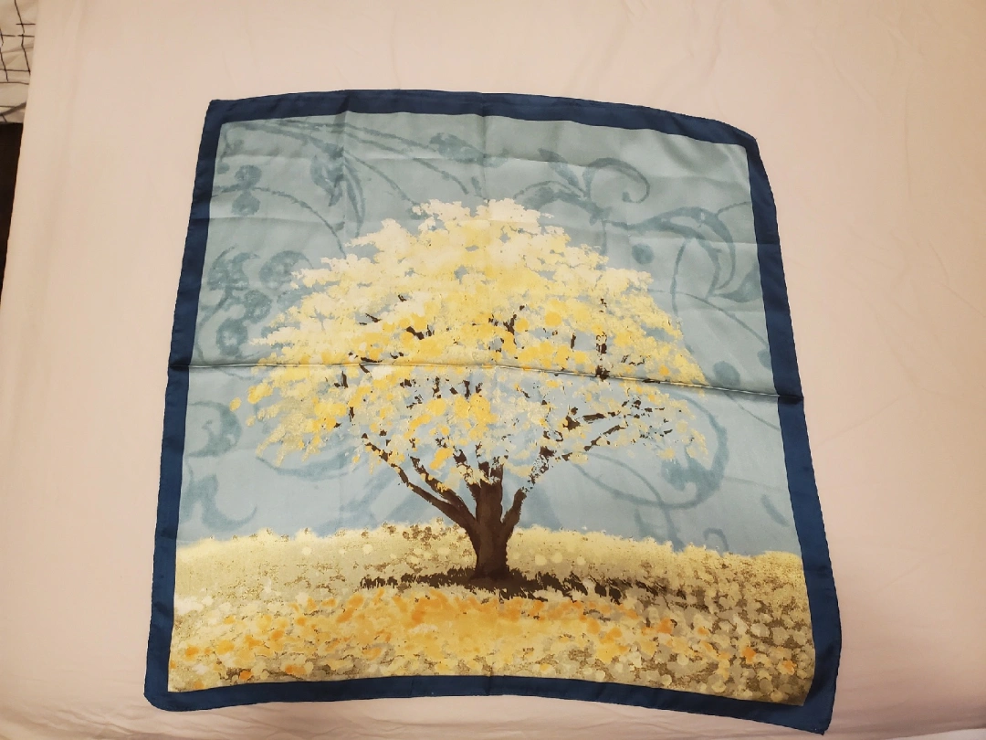 A lovely scarf with a beautiful tree print in shades of blue and yellow! It's in great condition and would add a touch of elegance to any outfit or bag.