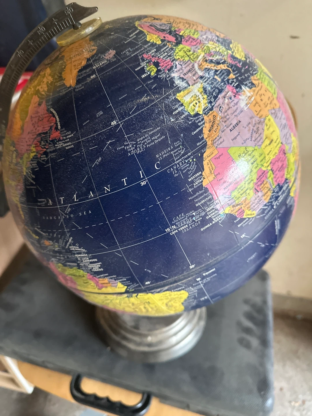 Selling a vintage globe! It has a dark blue ocean colour and various countries marked in different colours. A cool decorative item for your home or office