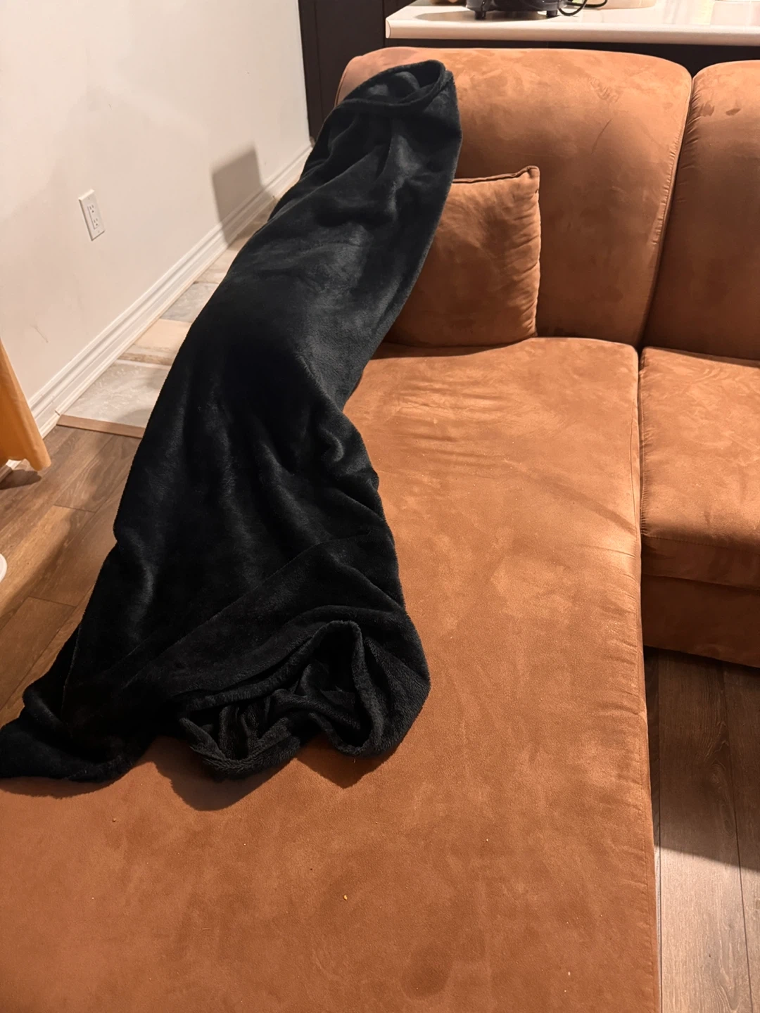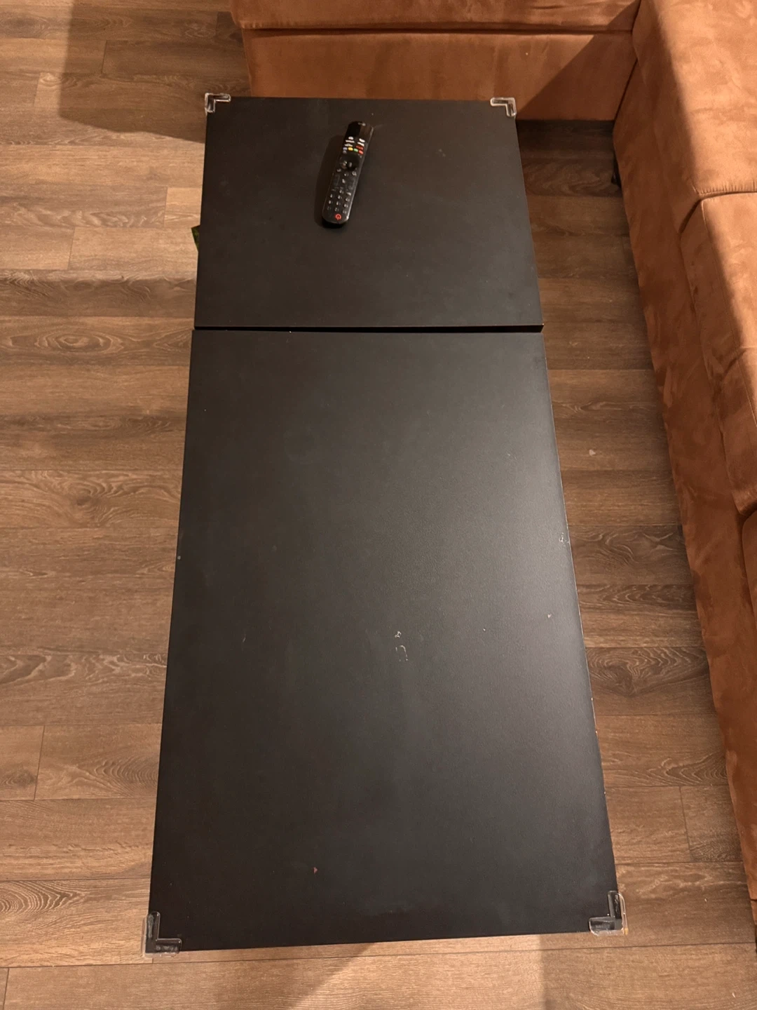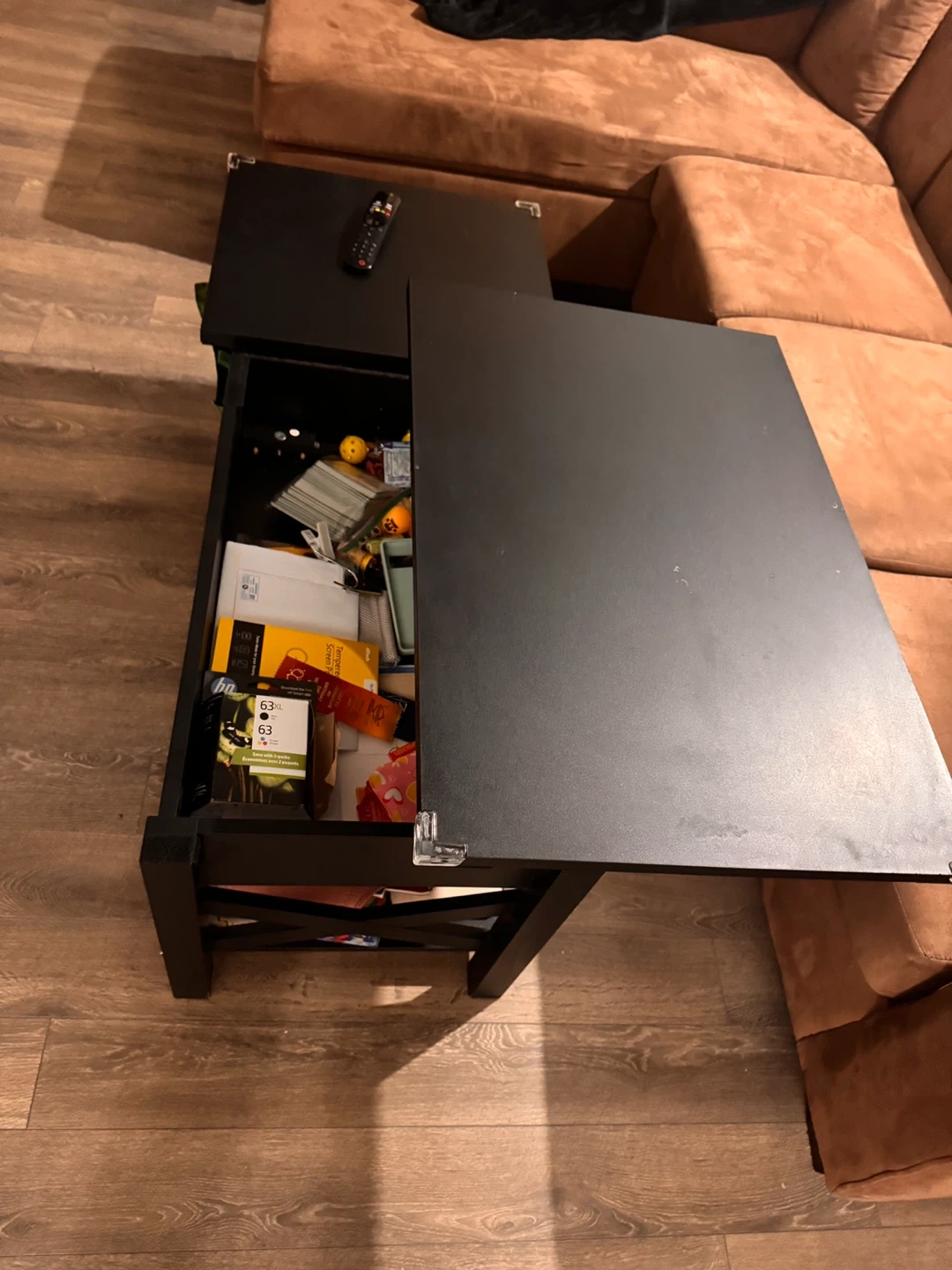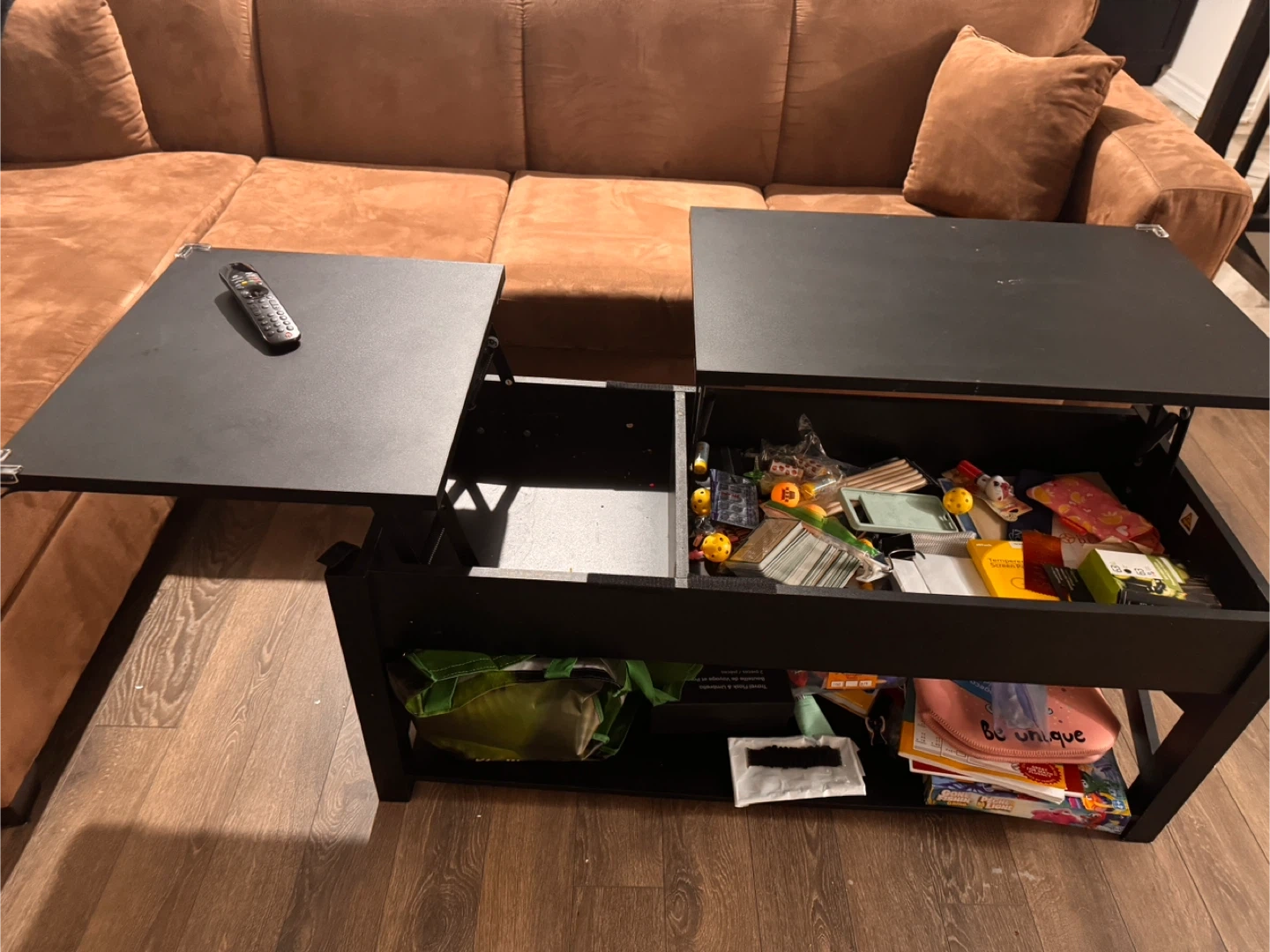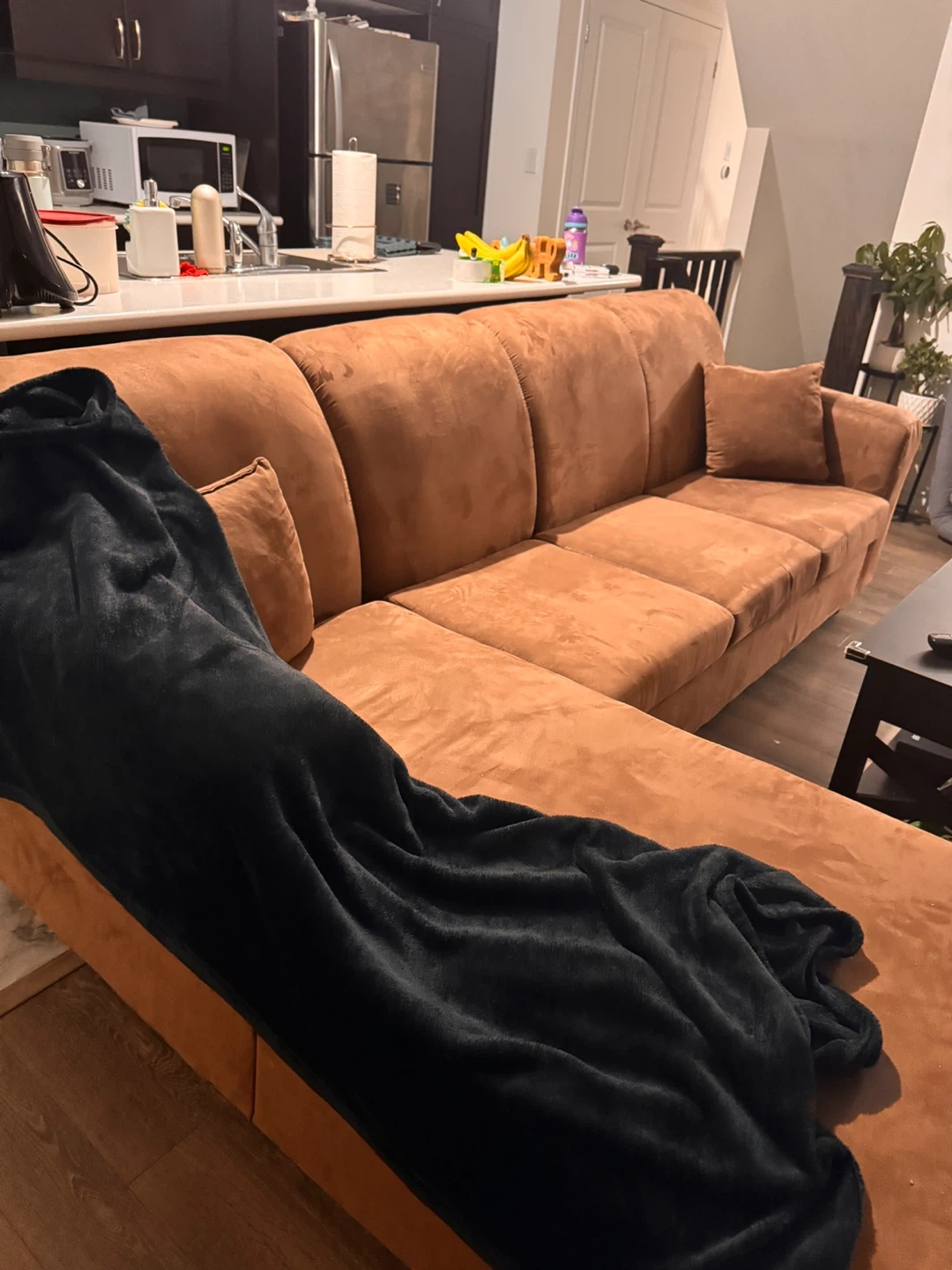 Selling a comfy brown sectional sofa! It's in good condition and would be a great addition to any living room. The colour is a nice warm brown that would match many decor styles. The cushion clothes are machine washable. If you're interested, send me a message! The center black table with storage is also a great addition to the living room. Well maintained.